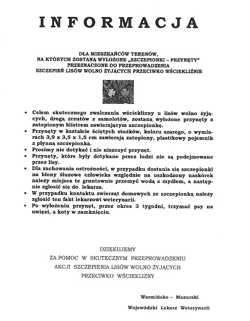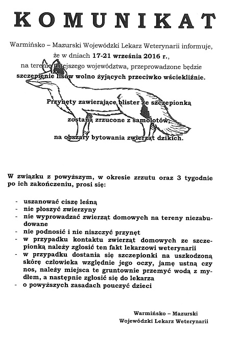 Warmińsko - Mazurski Wojewódzki Lekarz Weterynarii informuje, że w dniach 17-21 września 2016 r., na terenach tutejszego województwa przeprowadzone będzie szczepienie lisów wolno żyjących przeciwko wściekiliźnie...