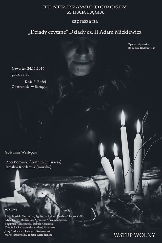 Stowarzyszenie Teatr Prawie Dorosły zaprasza na prezentację projektu 'Dziady czytane' wg II części Dziadów Adama Mickiewicza.. Pokaz odbędzie się w czwartek 24 listopada 2016 roku o godz. 22.30 w Kościele Bożej Opatrzności w Bartągu. Spektakl jest efektem współpracy aktorów naszego teatru z multiinstrumentalistą i kompozytorem Jarkiem Kordaczukiem oraz Piotrem Borowskim z Teatru im. St. Jaracza.