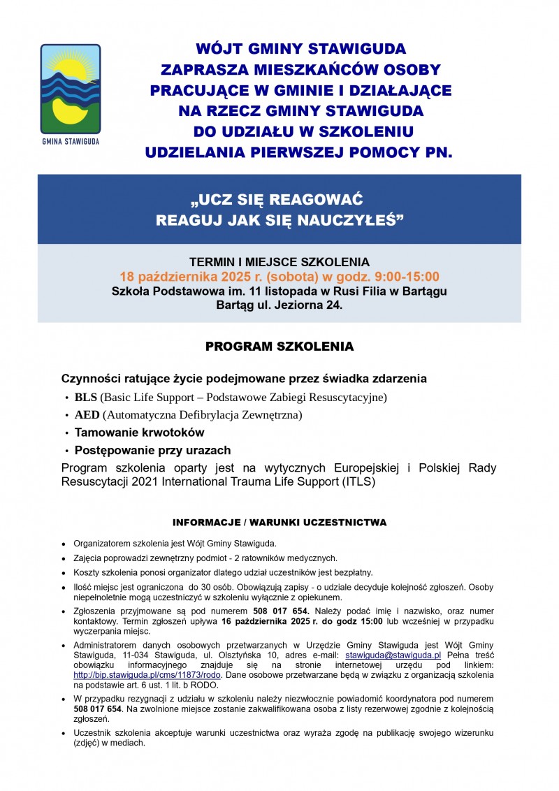 Bezpłatne szkolenie z udzielania pierwszej pomocy pn. „Ucz się reagować. Reaguj, jak się nauczyłeś!”
