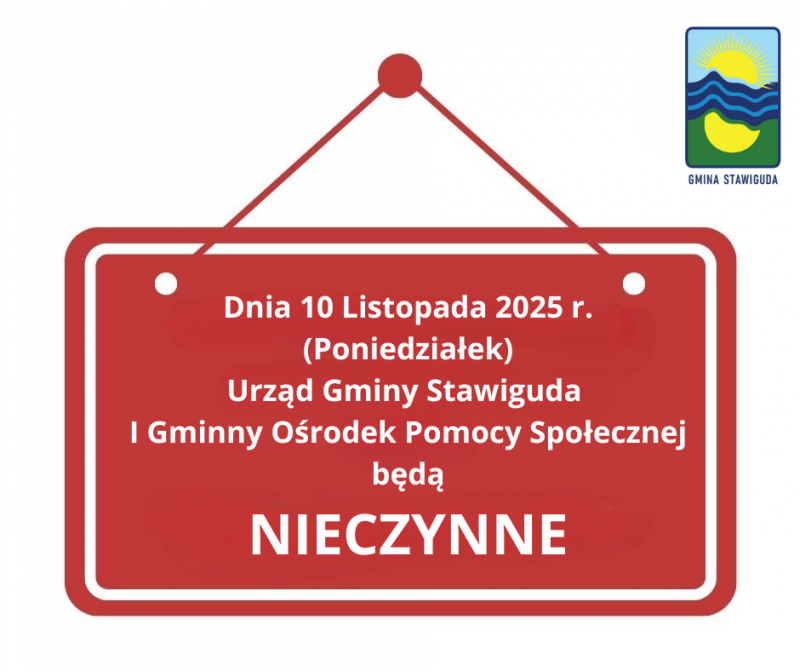 Uprzejmie informujemy, że w dniu 10 listopada 2025 r. (poniedziałek) Urząd Gminy Stawiguda oraz Gminny Ośrodek Pomocy Społecznej w Stawigudzie będą nieczynne.