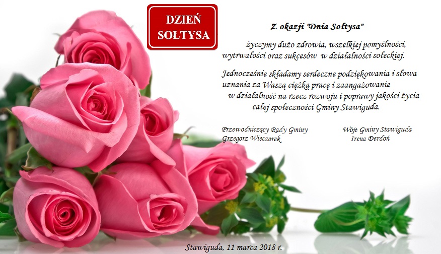 Z okazji Dnia Sołysa składamy wszystkim Sołtysom z terenu gminy Stawiguda wyrazy podziękowania za trud codziennej pracy i zaangażowanie w działalność na rzecz rozwoju lokalnej społeczności. Życzymy Pństwu zdrowia, wszelkiej pomyślności, a także nowych inicjatyw i satysfakcji z pełnionej funkcji.