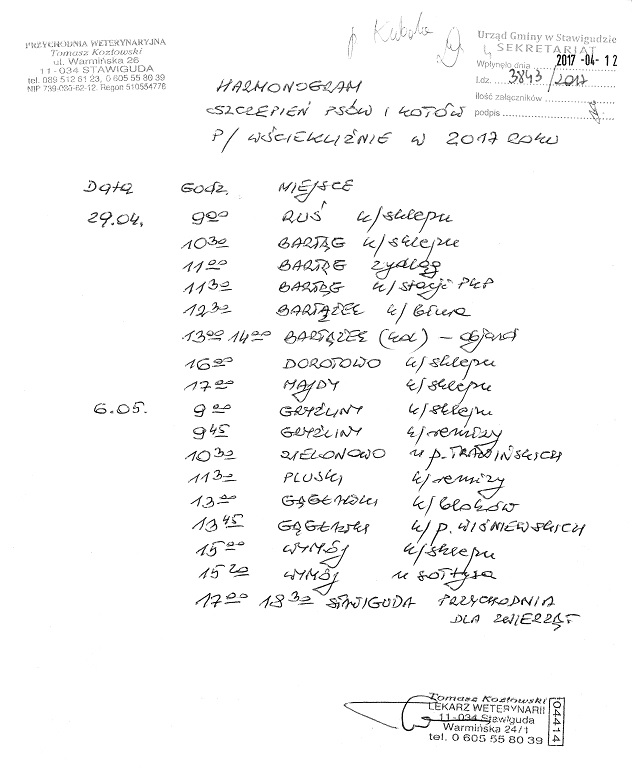 Harmonogram szczepień psów, kotów przeciw wściekliźnie w 2017 roku
