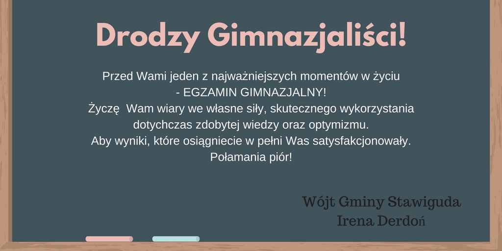 Drodzy Gimnazjaliści! Przed Wami jeden z najważniejszych momentów w życiu - EGZAMIN GIMNAZJALNY! Życzę wam wiary we własne siły, skutecznego wykorzystania dotychczas zdobytej wiedzy oraz optymizmu. Aby wyniki, które osiągniecie w pełni Was satysfakcjonowały. Połamania piór