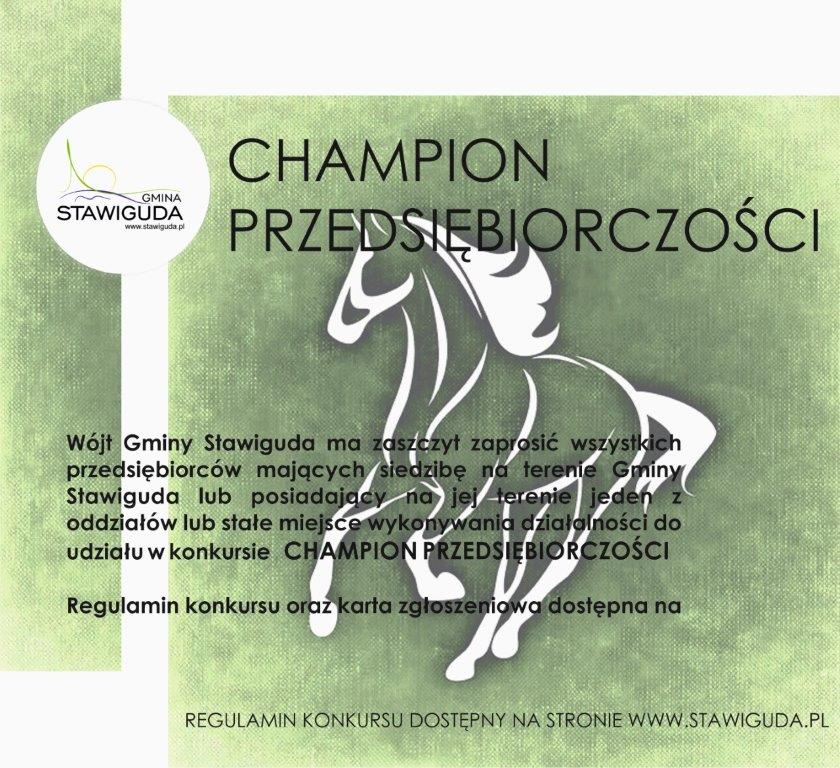 Wójt Gminy Stawiguda ma zaszczyt zaprosić wszystkich przedsiębiorców mających siedzibę na terenie Gminy Stawiguda lub posiadający na jej terenie jeden z oddziałów lub stałe miejsce wykonywania działalności do udziału w konkursie CHAMPION PRZEDSIĘBIORCZOŚCI