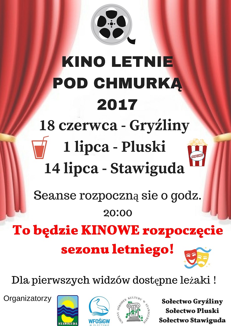 Rusza Kino letnie pod chmurką!! W tym roku seanse odbędą się w Gryźlinach, Pluskach oraz w Stawigudzie! Projekt jest współfinansowany ze środków Wojewódzkiego Funduszu Ochrony Środowiska i Gospodarki Wodnej w Olsztynie oraz ze środków sołeckich. ZAPRASZAMY SERDECZNIE!!