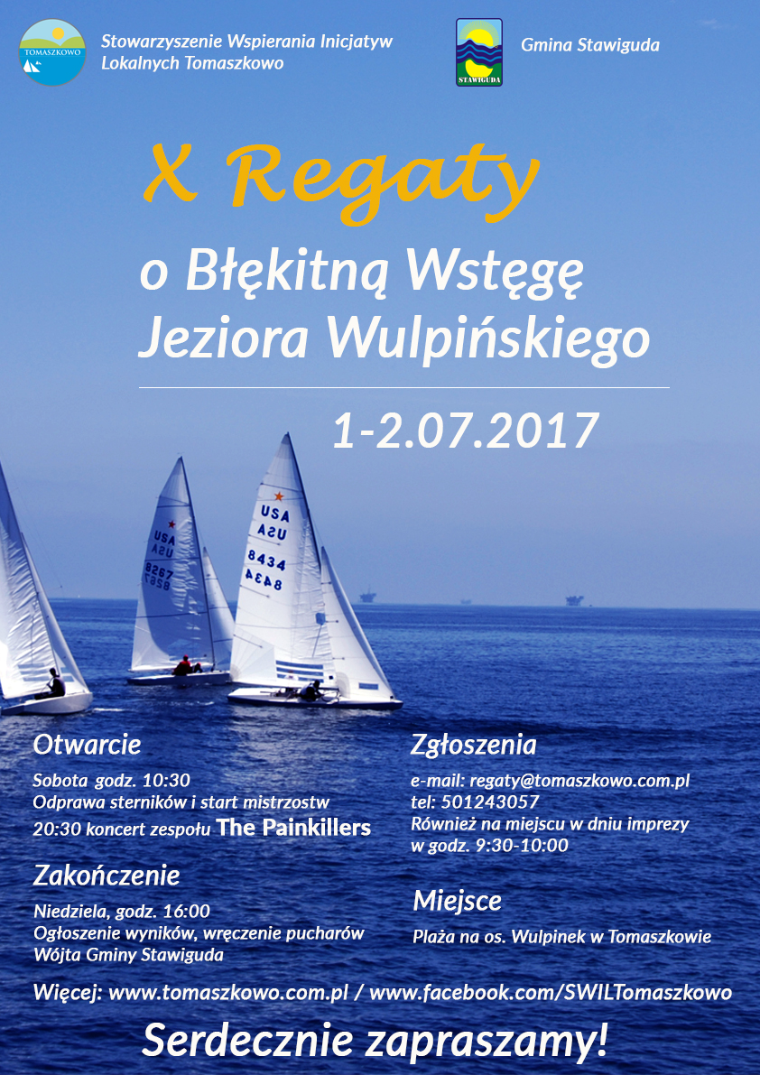 1 i 2 lipca 2017 r. nad jeziorem Wulpińskim w Tomaszkowie odbędą się X Regaty o Błękitną Wstęgę Jeziora Wulpińskiego! Regaty połączone będą z II Otwartymi Mistrzostwami Gminy Stawiguda w siatkówce plażowej.