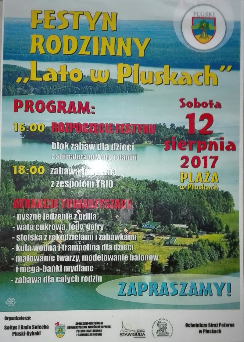 FESTYN RODZINY W PLUSKACH! Już 12 sierpnia 2017 r. (sobota) na plaży wiejskiej odbędzie się Festyn Rodzinny w Pluskach. W programie przewidziano wiele atrakcji! Serdecznie zapraszamy!