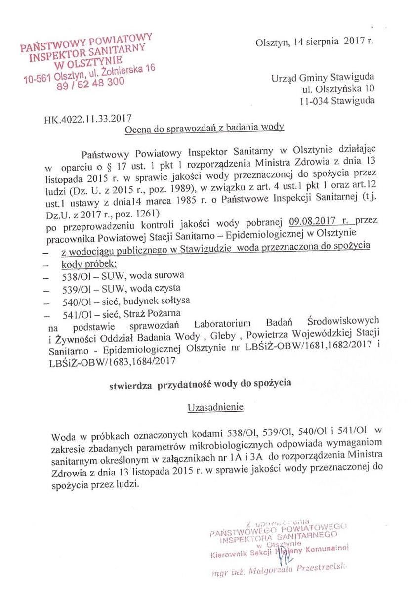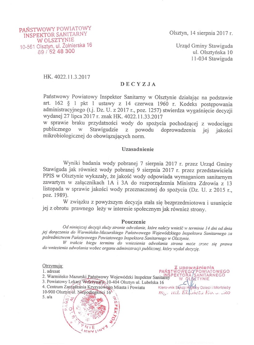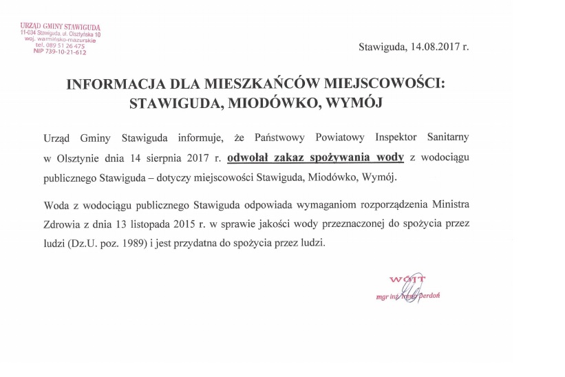 Informacja dla mieszkańców miejscowości Stawiguda, Miodówko, Wymój dotycząca spożywania wody z wodociągu publicznego w Stawigudzie.