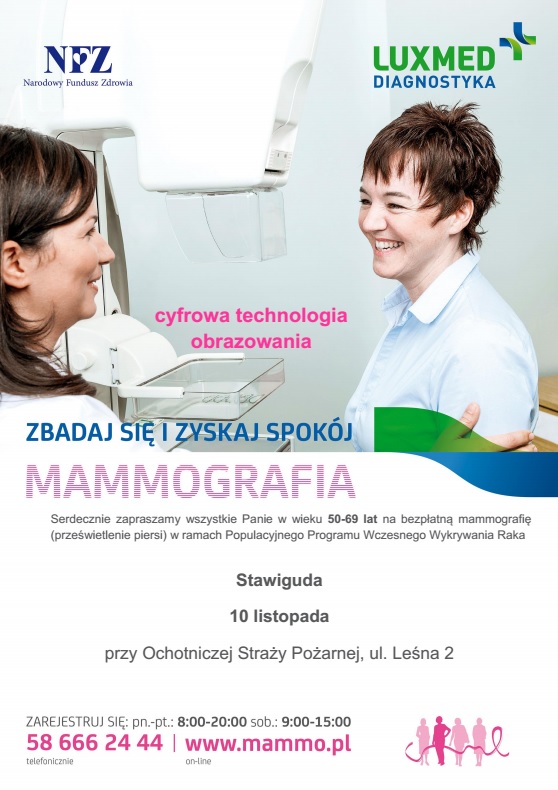 Mammografia trwa jedynie kilka minut i polega na zrobieniu 4 zdjęć rentgenowskich. Pozwala na rozpoznanie i wykrycie tzw. zmian bezobjawowych (guzków oraz innych nieprawidłowości w piersi) w bardzo wczesnym etapie rozwoju, wtedy, kiedy nie są one wyczuwalne przez kobietę lub lekarza, co bardzo istotnie zwiększa szansę wyleczenia. Bezpłatne badania mammograficzne w mammobusie odbędą się: