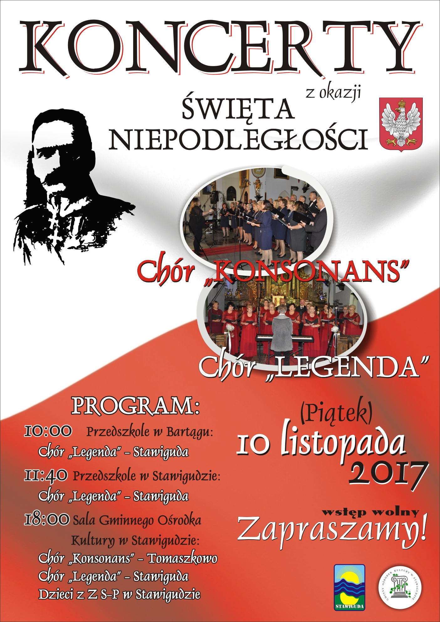 Gmina Stawiguda i Gminny Ośrodek Kultury w Stawigudzie serdecznie zapraszają mieszkańców Gminy Stawiguda na UROCZYSTY KONCERT PIEŚNI PATRIOTYCZNYCH w wykonaniu chórów "Legenda" i "Konsonans" oraz uczniów Zespołu Szkolno - Przedszkolnego w Stawigudzie, który odbędzie się w dniu 10 listopada br. o godz. 18.00 w Gminnym Ośrodku Kultury w Stawigudzie. WSTĘP WOLNY.