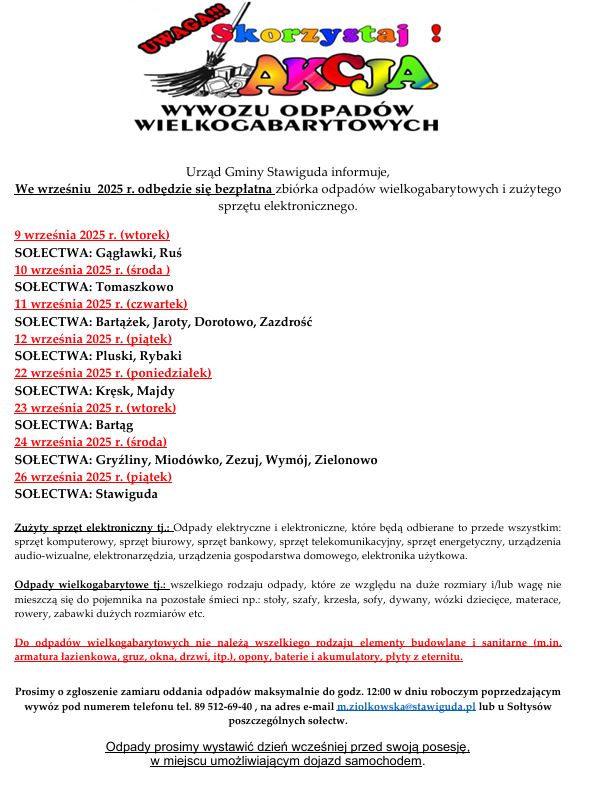 Urząd Gminy Stawiguda informuje, iż we wrześniu 2025 r. odbędzie się bezpłatna zbiórka odpadów wielkogabarytowych i zużytego sprzętu elektronicznego. Informacja dotyczy wyłącznie zabudowy jednorodzinnej.