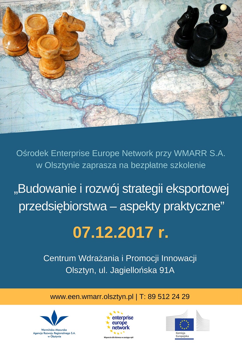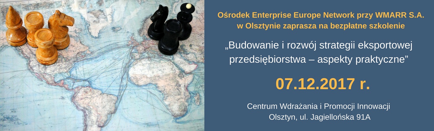 Szanowni Państwo, ośrodek Enterprise Europe Network działający przy Warmińsko – Mazurskiej Agencji Rozwoju Regionalnego S.A. w Olsztynie zaprasza na szkolenie pt. „Budowanie i rozwój strategii eksportowej przedsiębiorstwa – aspekty praktyczne”, które odbędzie się 07.12.2017 r. w Centrum Wdrażania i Promocji Innowacji w Olsztynie, ul. Jagiellońska 91A.