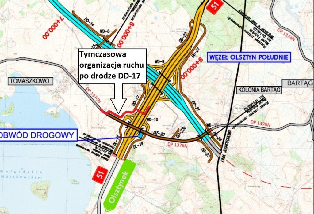 W środę (21 lutego 2018 r.) o godz. 12:00 nastąpi zmiana organizacji ruchu w okolicach skrzyżowania drogi S51 z drogą powiatową biegnącą w kierunku Tomaszkowa (DP 1370). Zmiana polegać będzie na przełożeniu ruchu z odcinka drogi powiatowej DP 1370 na nowo wybudowaną drogę dojazdową DD-17 na węźle Olsztyn Południe i połączenie z S51.
