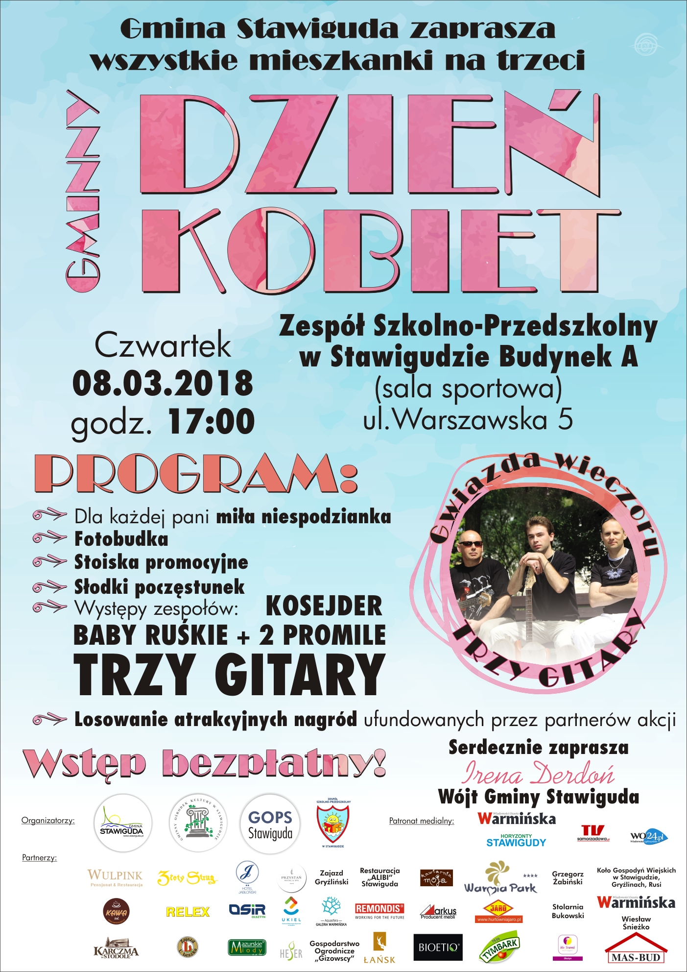 Gmina Stawiguda, Gminny Ośrodek Pomocy Społecznej w Stawigudzie oraz Gminny Ośrodek Kultury w Stawigudzie serdecznie zapraszają wszystkie Mieszkanki Gminy Stawiguda na III GMINNY DZIEŃ KOBIET, który odbędzie się w czwartek 8 marca br. o godz. 17:00 w sali sportowej Zespołu Szkolno-Przedszkolnego (Budynek A) w Stawigudzie.