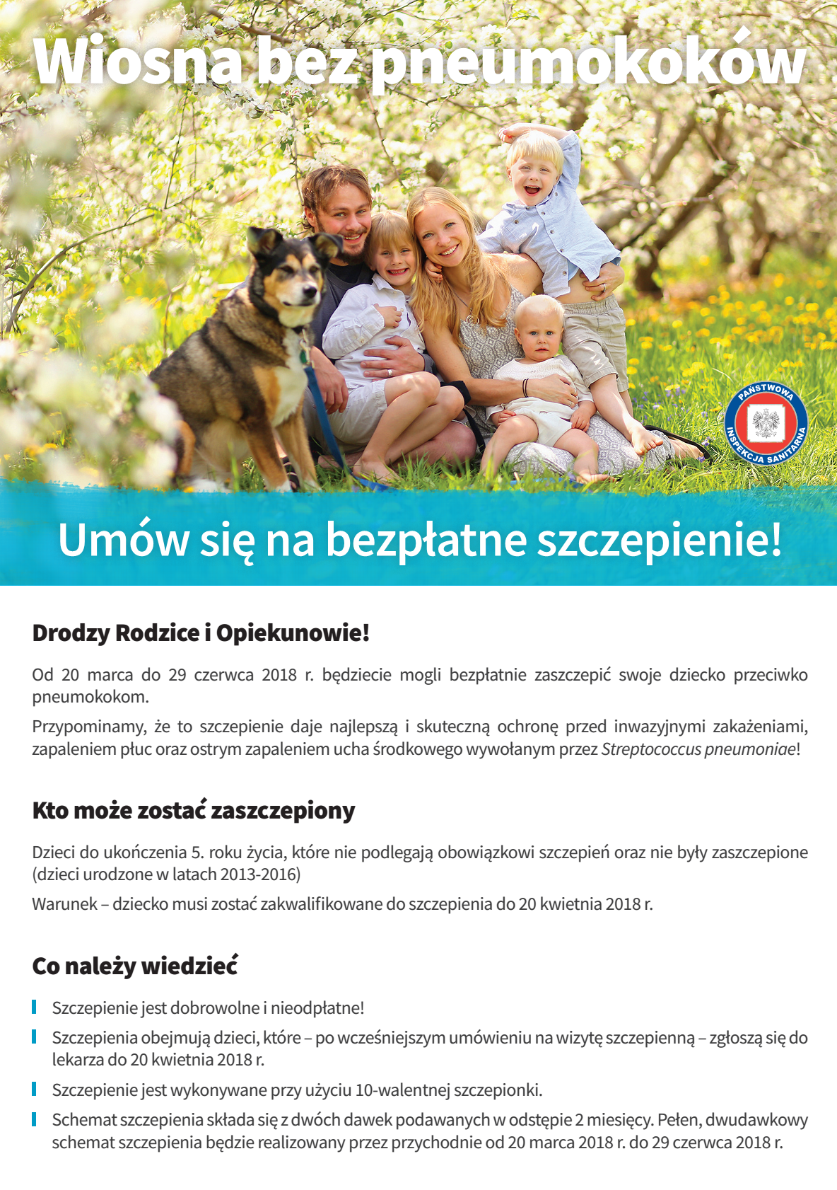 Drodzy Rodzice i Opiekunowie! Od 20 marca do 29  czerwca będziecie mogli bezpłatnie zaszczepić swoje dziecko przeciwko pneumokokom. Przypominamy, że to szczepienie daje najlepszą i skuteczną ochronę przed inwazyjnymi zakażeniami, zapaleniem płuc oraz ostrym zapaleniem ucha środkowego wywołanym przez Streptococcus pneumoniae!
