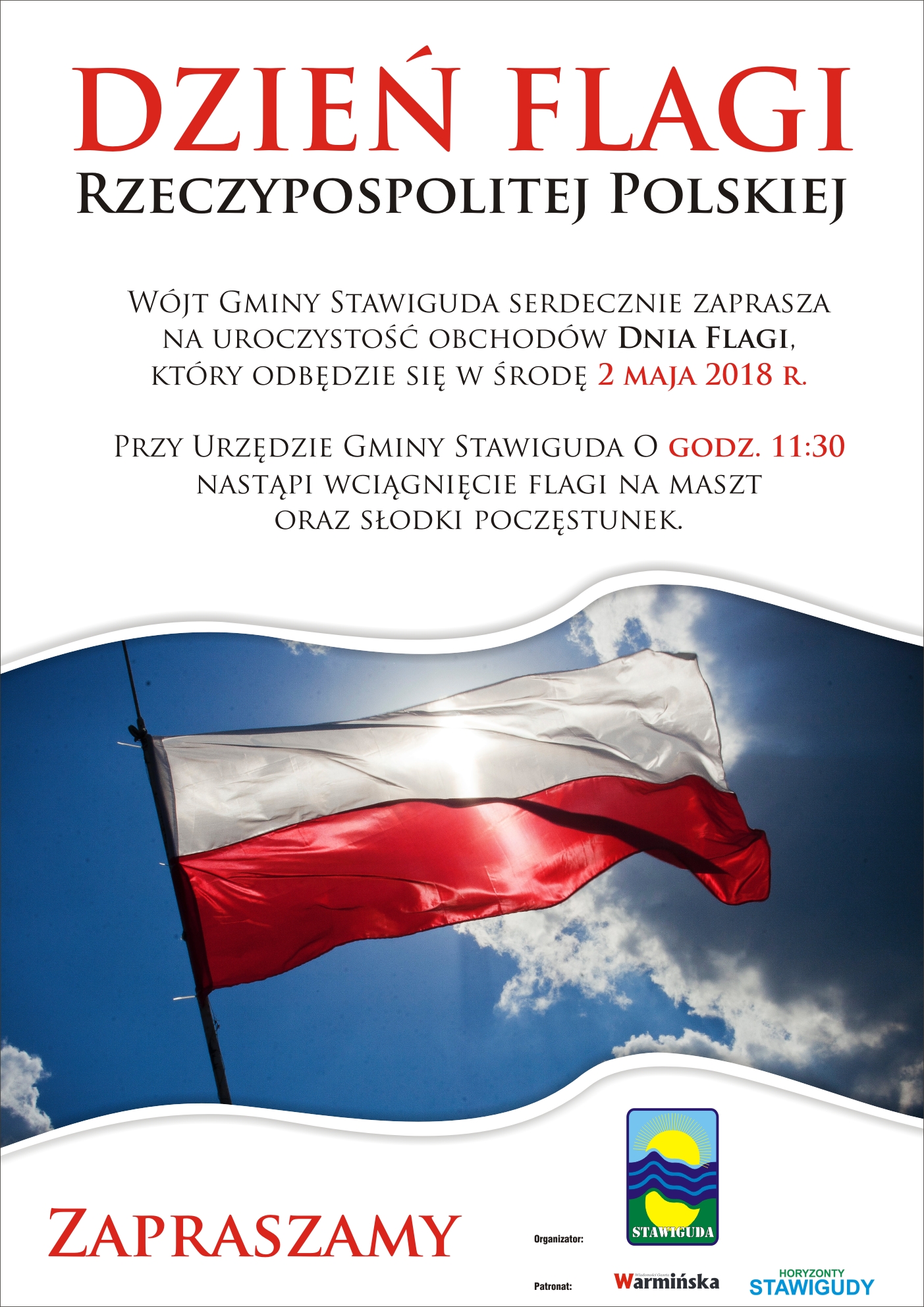 02.05.2018 DZIEŃ FLAGI Rzeczypospolitej Polskiej w Stawigudzie. Wójt Gminy Stawiguda serdecznie zaprasza na uroczystość obchodów Dnia Flagi, który odbędzie się w środę 2 maja 2018 r. Przy Urzędzie Gminy Stawiguda O godz. 11:30 nastąpi wciągnięcie flagi na maszt oraz słodki poczęstunek. Wszystkich mieszkańców serdecznie zapraszamy.