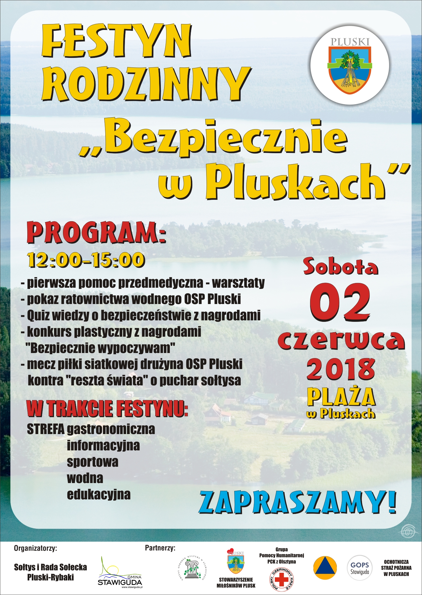 FESTYN RODZINNY „Bezpiecznie Pluskach” Gmina Stawiguda, Sołtys oraz Rada Sołecka Pluski-Rybaki zaprasza na FESTYN RODZINNY realizowany pod hasłem „Bezpiecznie w Pluskach”, który odbędzie się w sobotę 2 czerwca br. na plaży głównej.