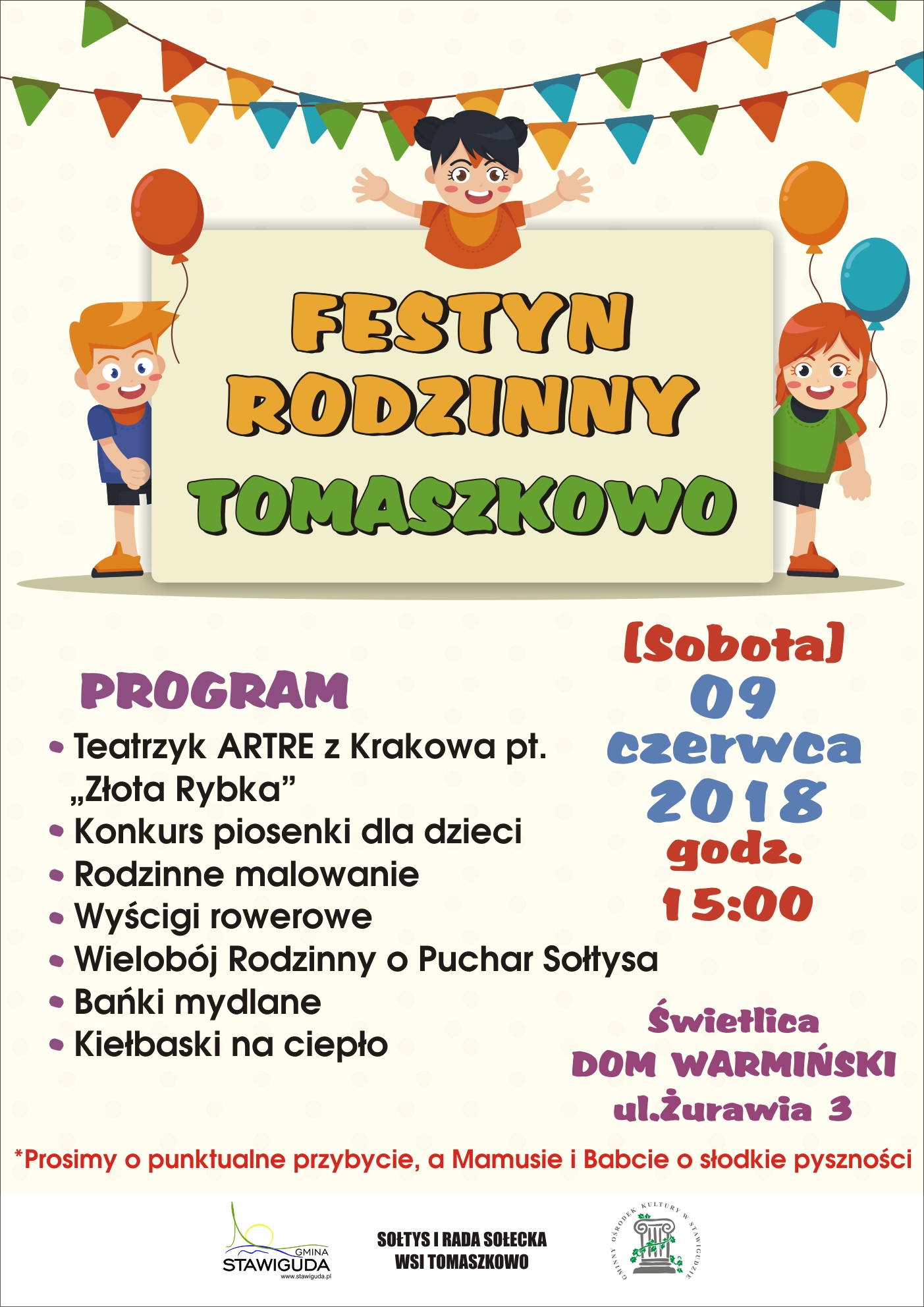 Gmina Stawiguda, Sołtys i Rada Sołecka wsi Tomaszkowo wraz z Gminnym Ośrodkiem Kultury w Stawigudzie zapraszają na FESTYN RODZINNY, który odbędzie się w sobotę 9 czerwca br. przy świetlicy wiejskiej „DOM WARMIŃSKI” ul. Żurawia 3 w Tomaszkowie.