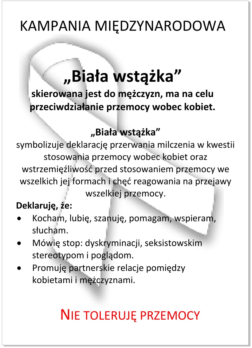 W ramach Kampanii Pracownicy Gminnego Ośrodka Pomocy Społecznej w Stawigudzie wraz  z  Pracownikami Posterunku Policji   w Stawigudzie będą rozdawali ulotki i przypinali mężczyznom białą wstążkę – symbol kampanii.