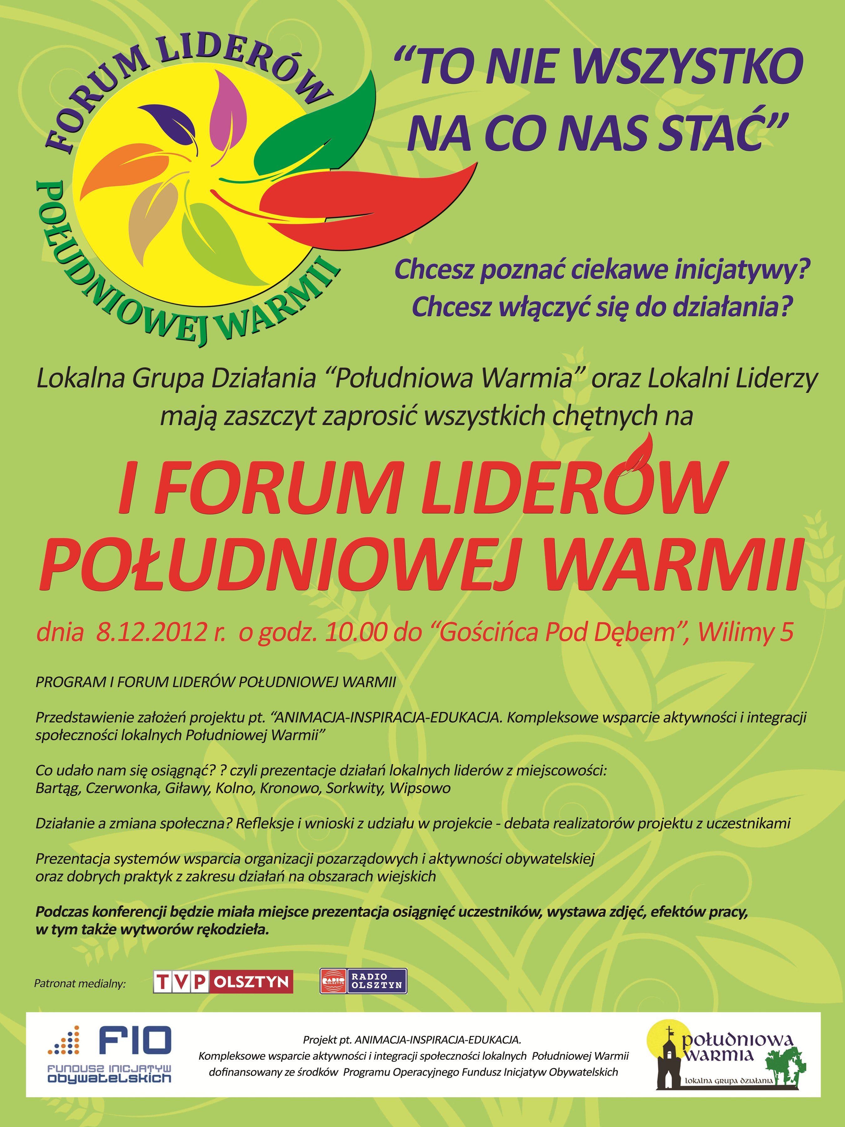 Realizacja I Forum Liderów Południowej Warmii jest wynikiem ogromnego zaangażowania uczestników projektu pt. ANIMACJA-INSPIRACJA-EDUKACJA.Kompleksowe wsparcie aktywności i integracji społeczności lokalnych Południowej Warmii, dofinansowanego ze środków Programu Operacyjnego Fundusz Inicjatyw Obywatelskich,realizowanego przez Lokalną Grupę Działania Stowarzyszenie „Południowa Warmia”.