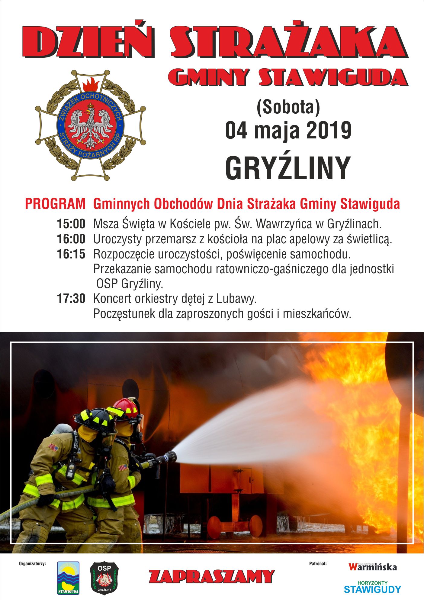 Wójt Gminy Stawiguda Michał Kontraktowicz serdecznie zaprasza na uroczyste obchody Dnia Strażaka, które odbędą się w sobotę 04 maja 2019 r. w Gryźlinach. Podczas uroczystości odbędzie się przekazanie samochodu ratowniczo-gasniczego dla jednostki Ochotniczej Straży Pożarnej Gryźliny.