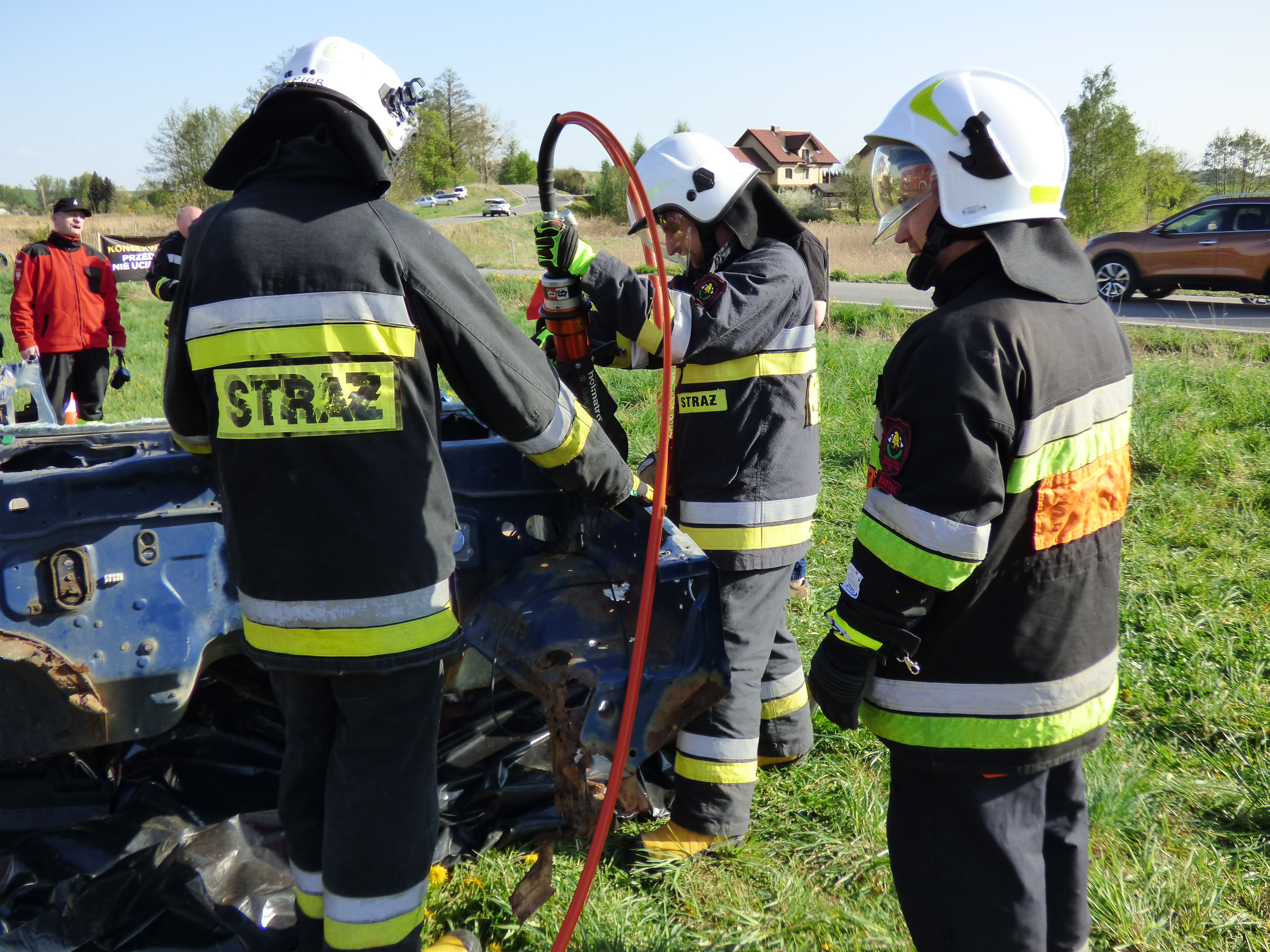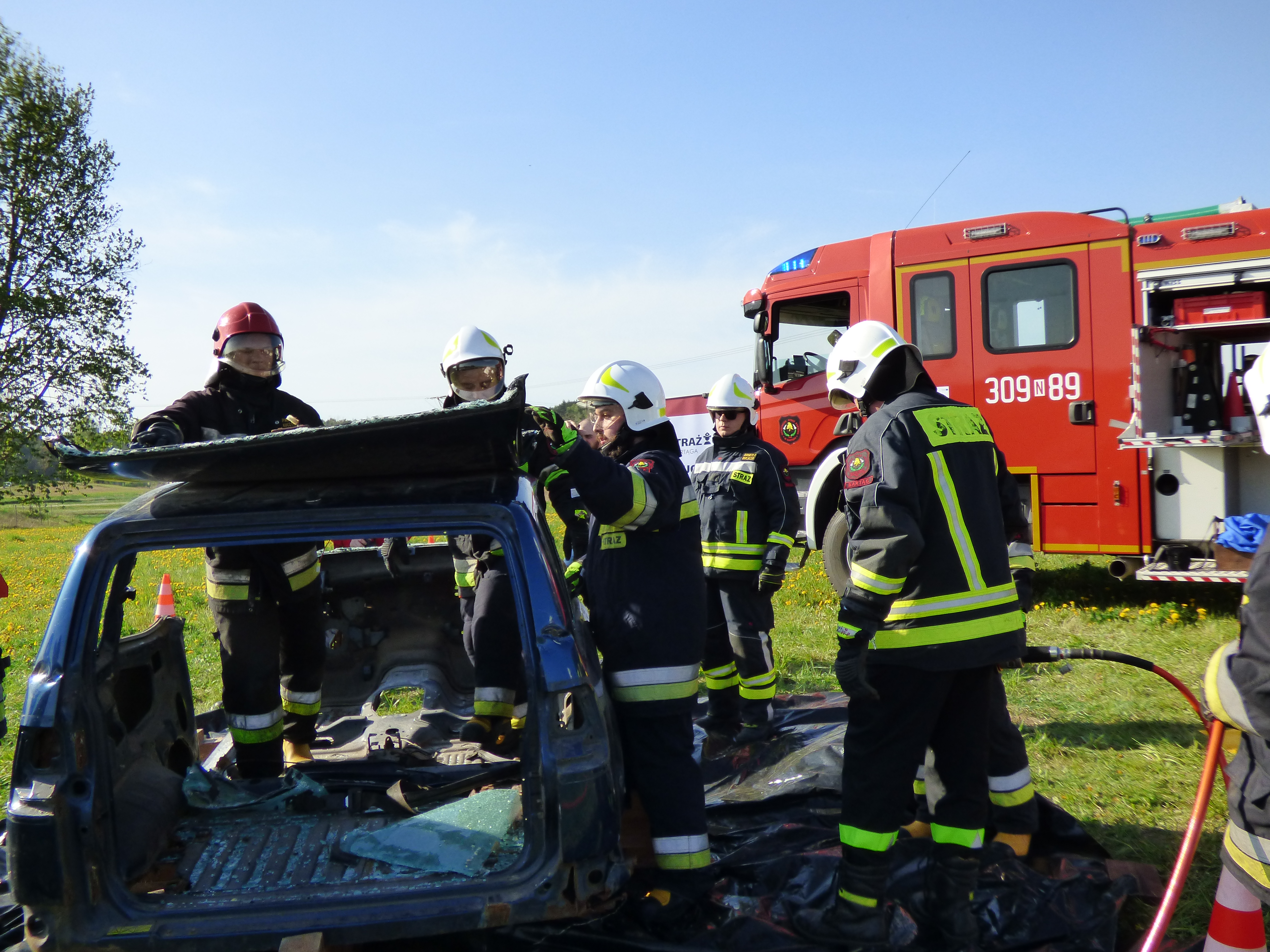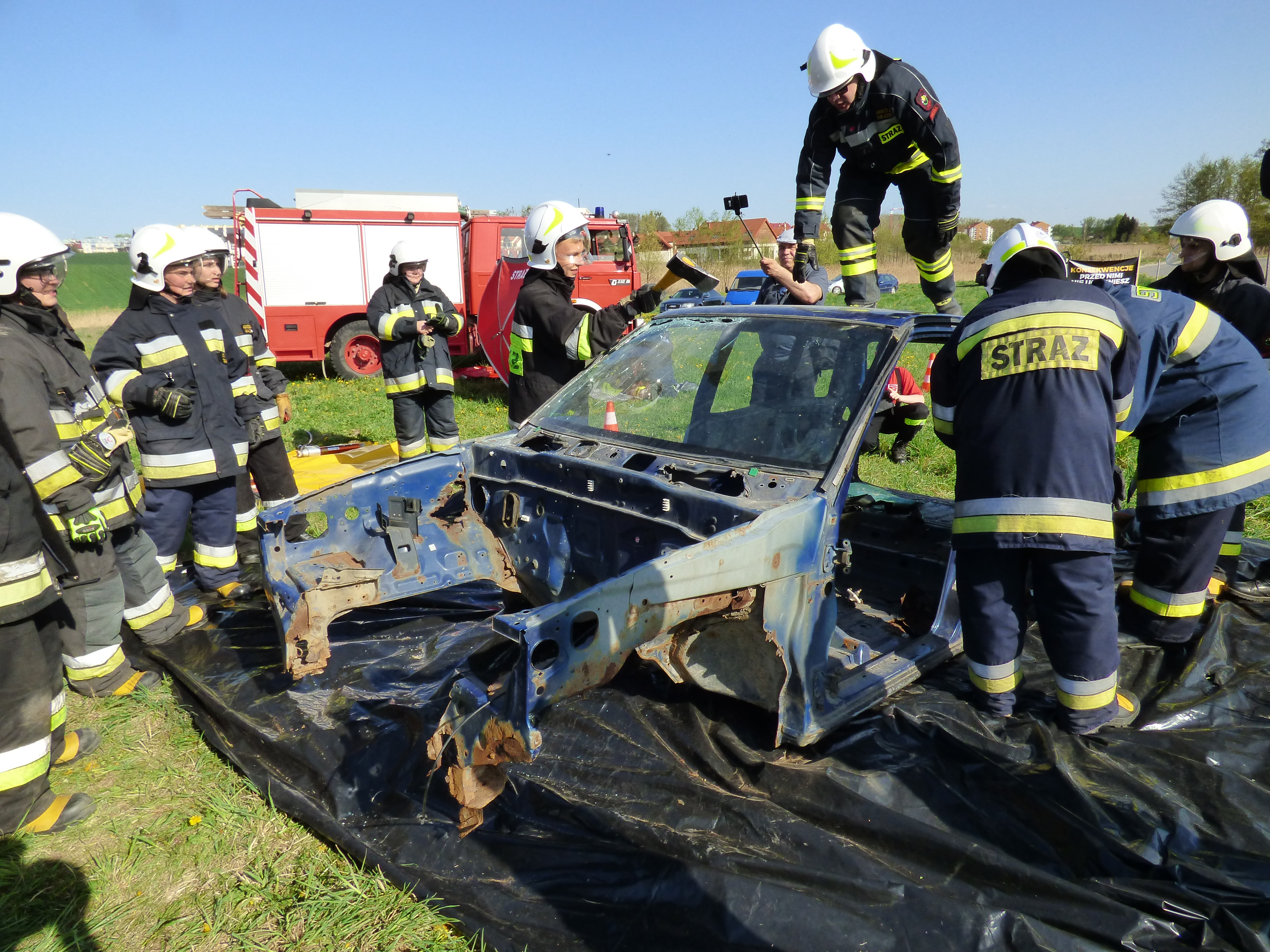 Podczas symulowanego wypadku ćwiczono zasady uwalniania poszkodowanych z rozbitego pojazdu oraz zasady udzielania pierwszej pomocy przedmedycznej.