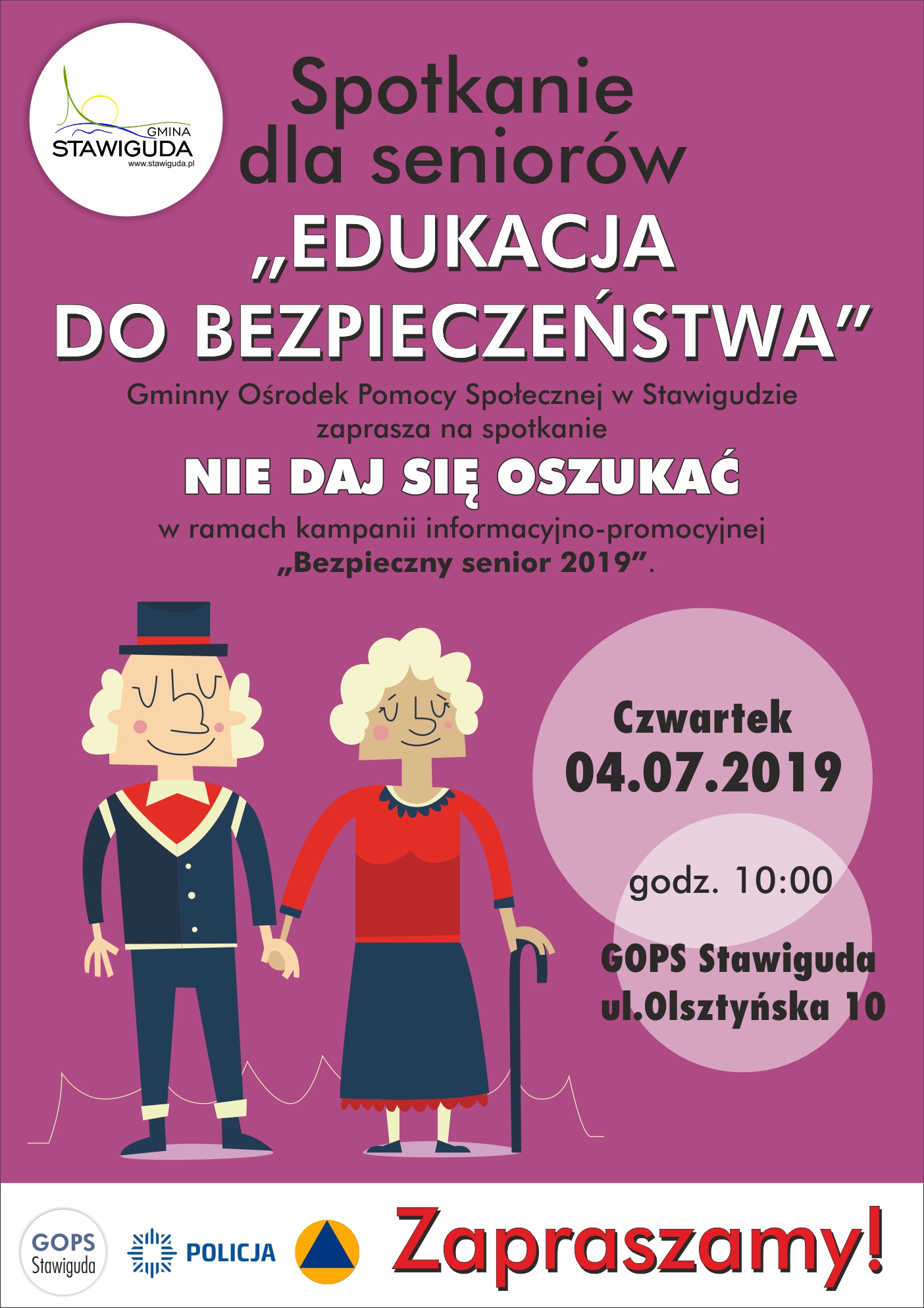 Gminny Ośrodek Pomocy Społecznej w Stawigudzie zaprasza wszystkich seniorów oraz osoby niepełnosprawne z Gminy Stawiguda na spotkanie edukacyjne pt. "Nie daj się oszukać" w ramach kampanii informacyjno-promocyjnej "Bezpieczny Senior 2019".