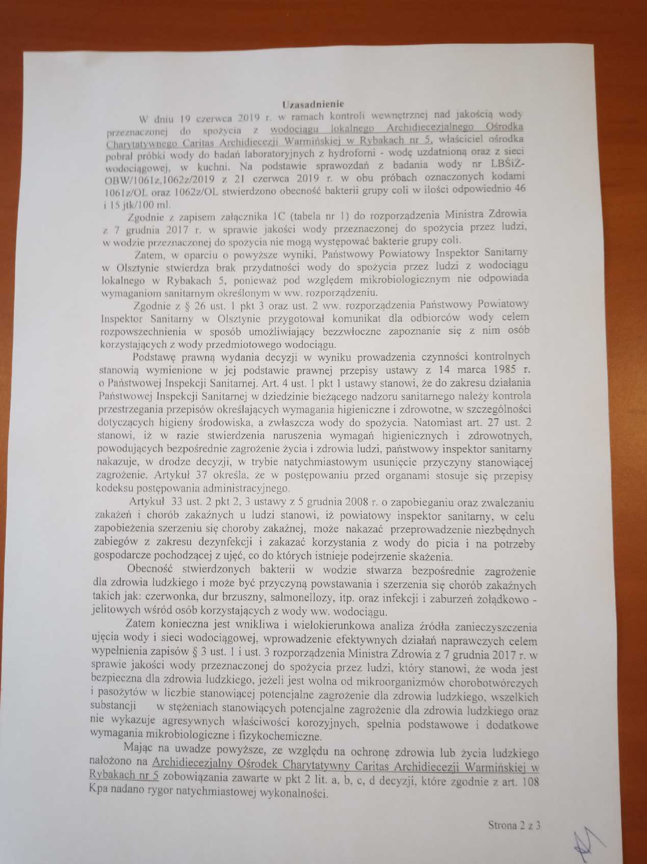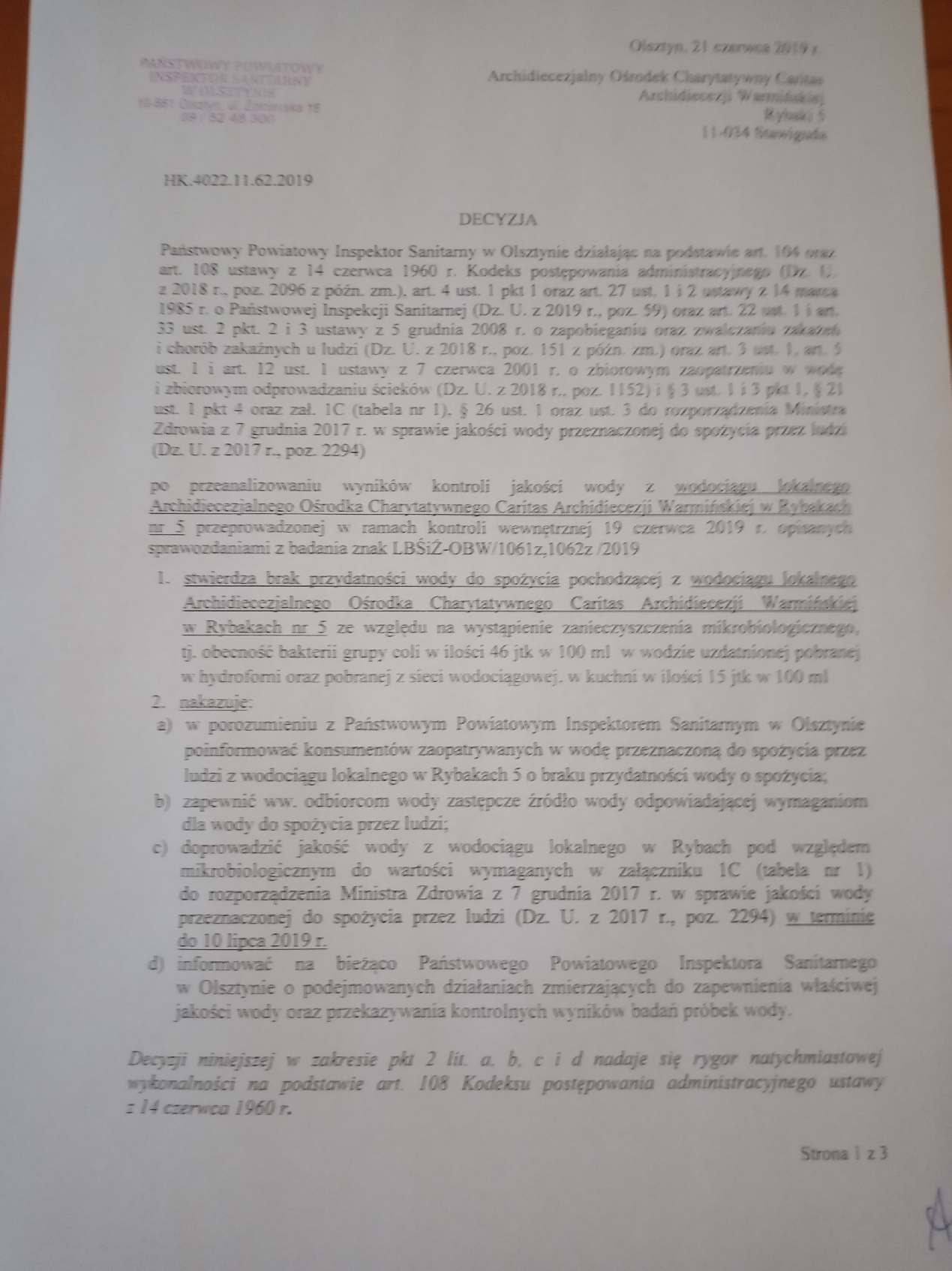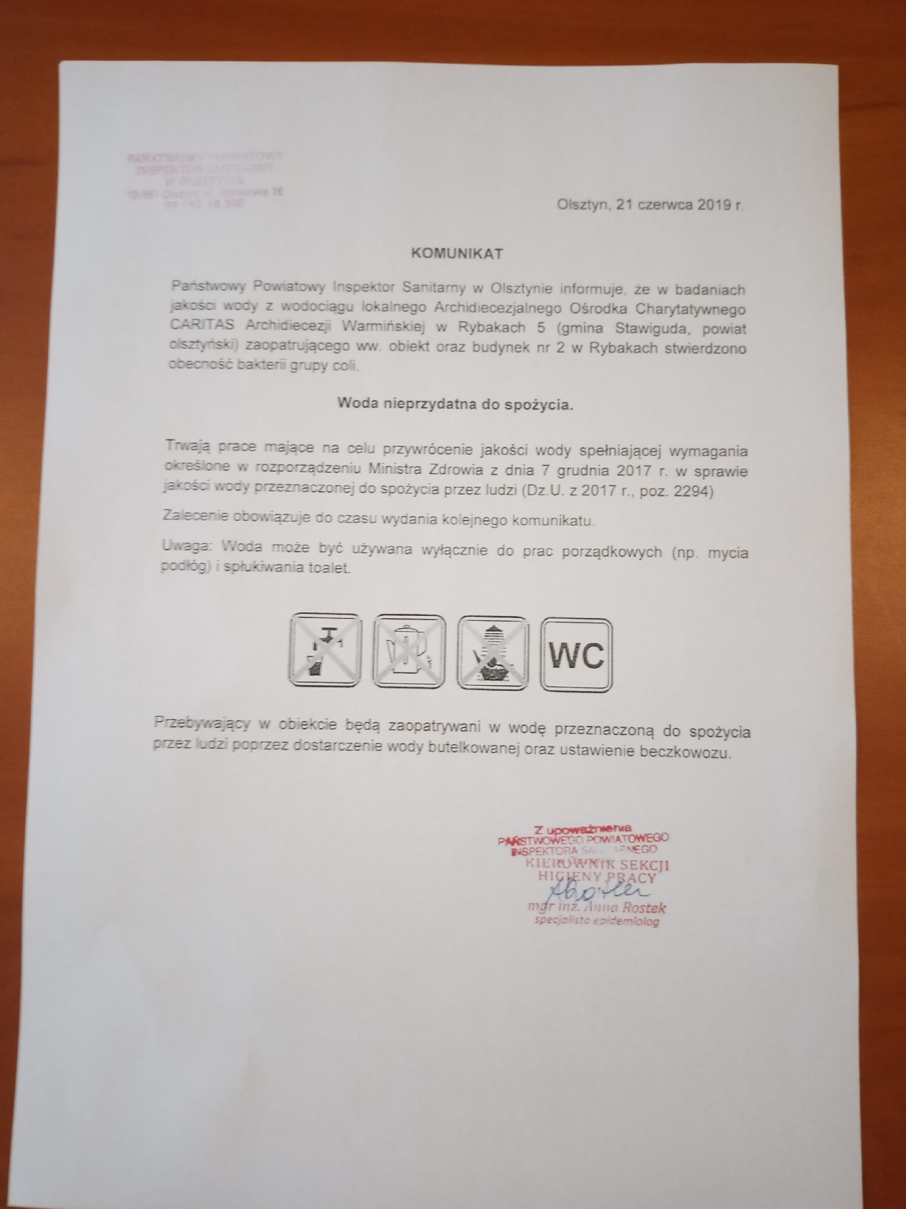 W związku ze stwierdzeniem w próbkach wody z wodociągu lokalnego Archidiecezji Warmińskiej w Rybakch obecności bakterii z grupy coli informujemy, że woda z wodociągu lokalnego w miejscowości Rybaki nie nadaje się do spożycia.