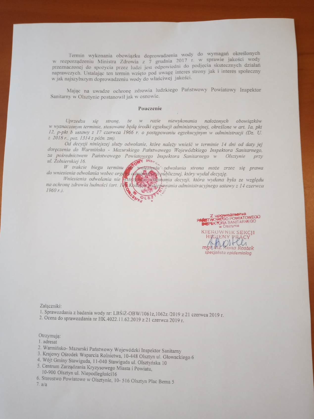 Woda może być używana wyłącznie do prac porządkowych (np: mycia podłóg i spłukiwania toalet). Do miejscowości zostanie podstawiony beczkowóz z wodą zdatną do picia.