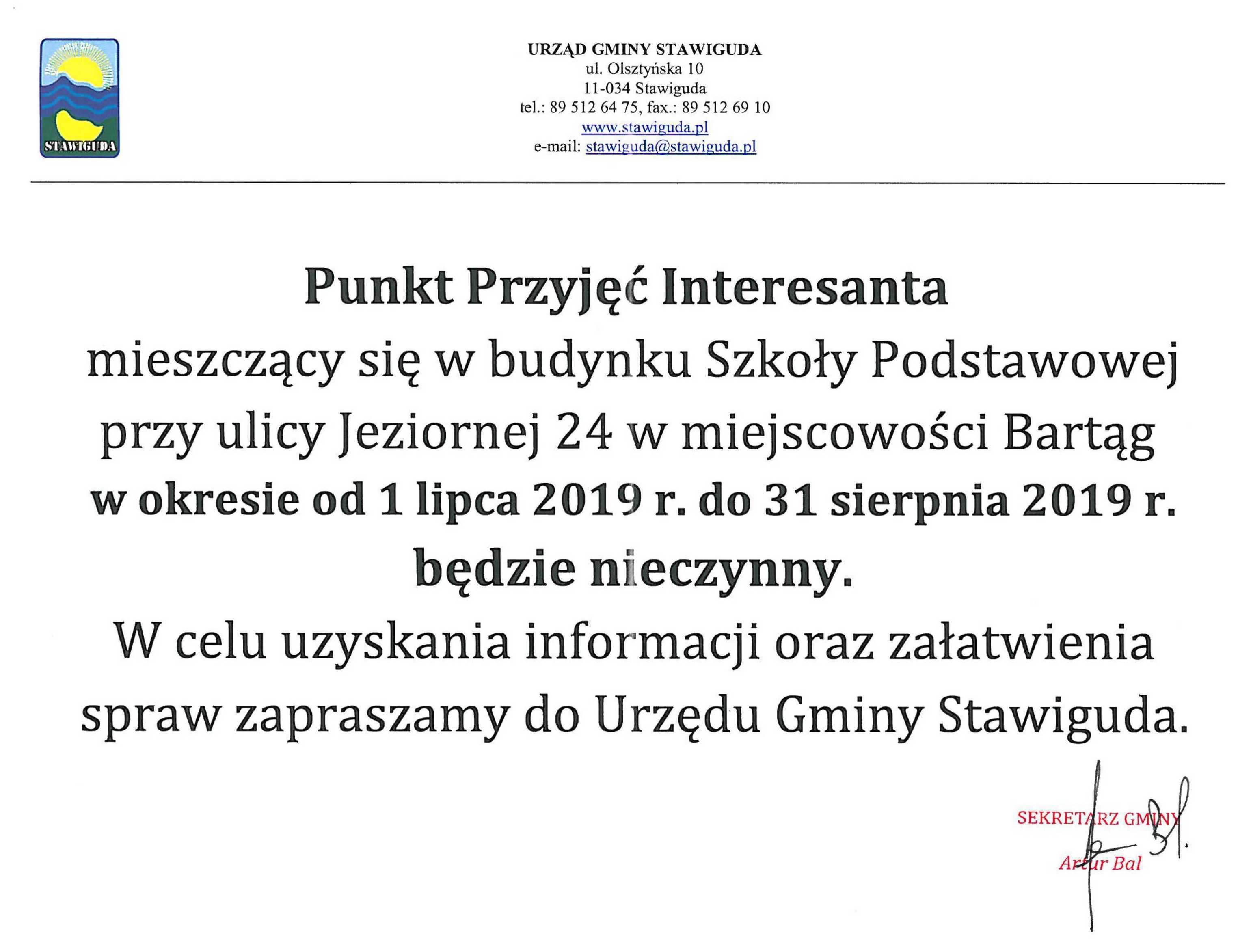 Informacja - zmiany w czasie pracy Punktu Przyjęć Interesanta w Bartągu