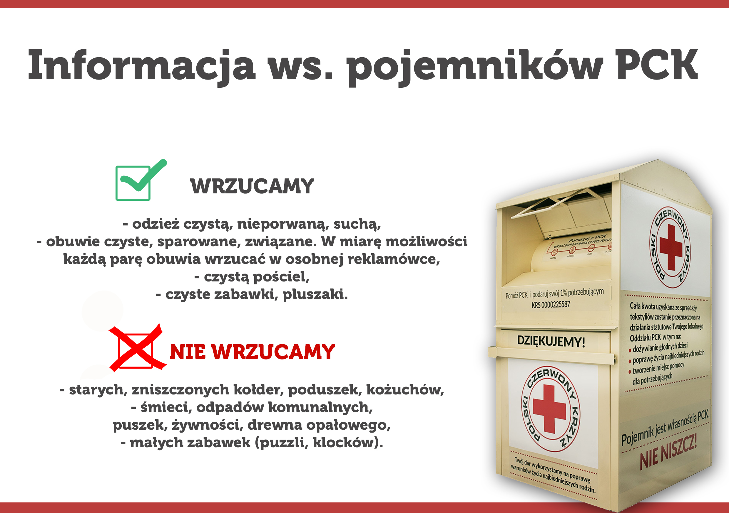 Warmińsko - Mazurski Oddział Okręgowy PCK przypomina co należy wrzucać, a co nie do pojemników do zbiórki odzieży używanej ze znakiem PCK.