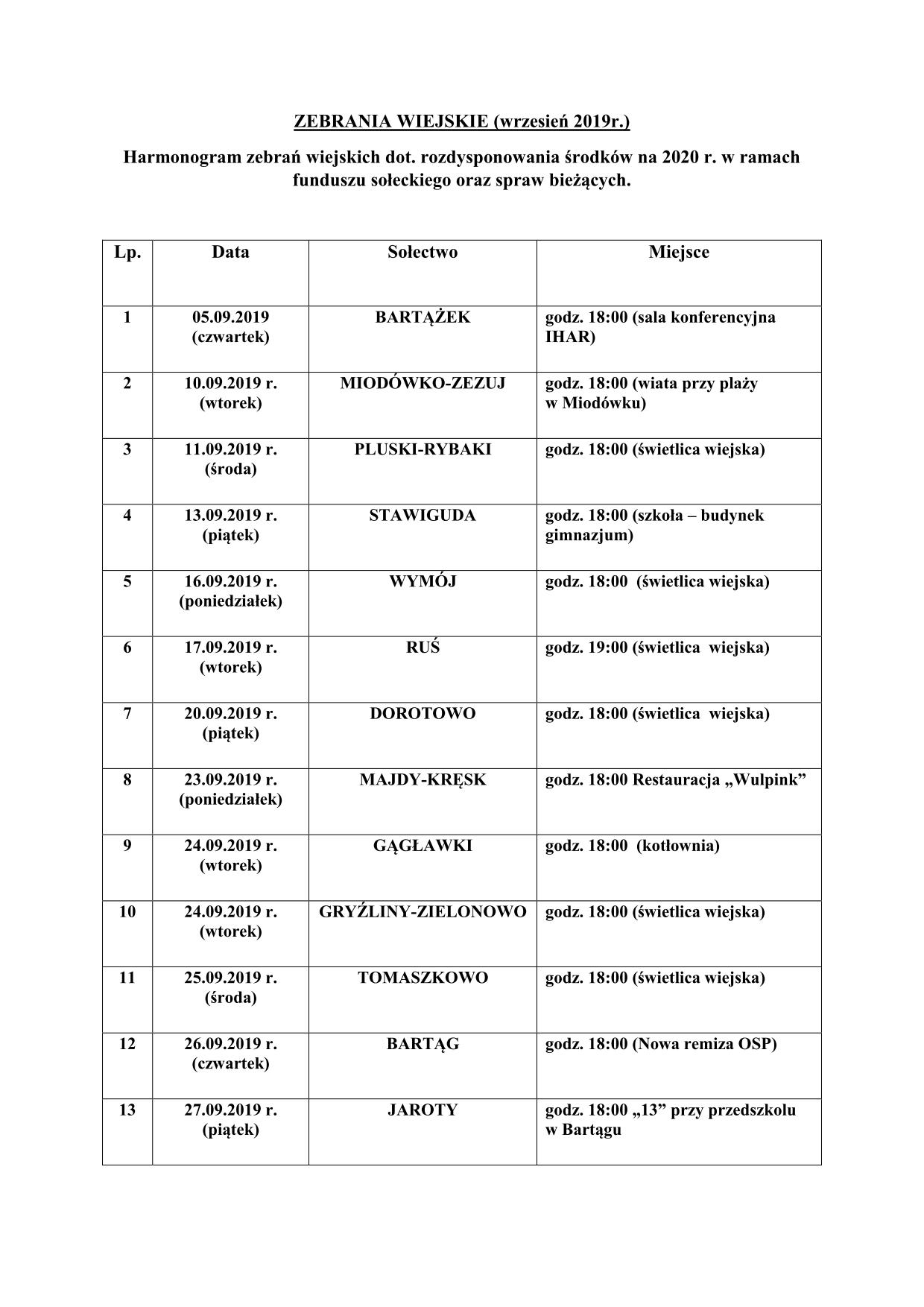 Harmonogram zebrań wiejskich - wrzesień 2019 r.