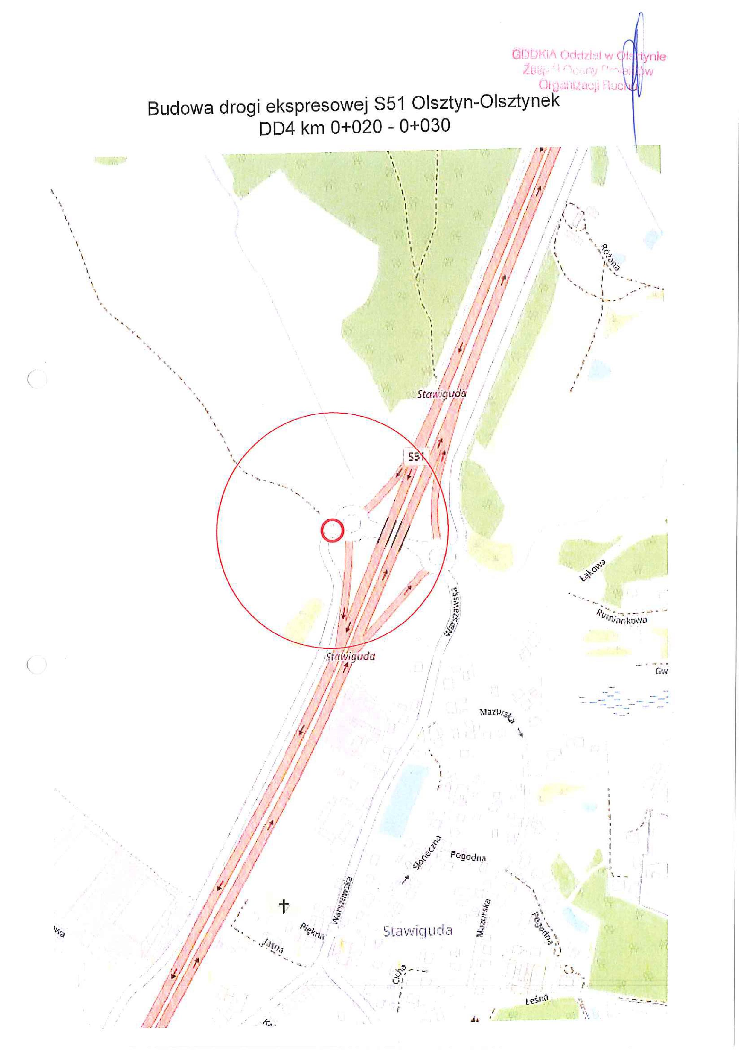 Energopol - Szczecin S.A., wykonawca zadania „Budowa drogi ekspresowej S-51 na odcinku Olsztyn-Olsztynek” informuje, że w dniach 18-21.10.2019 (piątek – poniedziałek) planowane jest zamknięcie drogi dojazdowej DD4 w km 0+020 – 0+030 (miejsce wyłączenia z ruchu zaznaczone na załączonych rysunkach). W związku z powyższym, ruch samochodów ciężarowych z i do msc. Stawiguda będzie możliwy tylko przez węzeł drogowy Gryźliny, a o wprowadzonym objeździe będą informowały dodatkowe znaki drogowe.