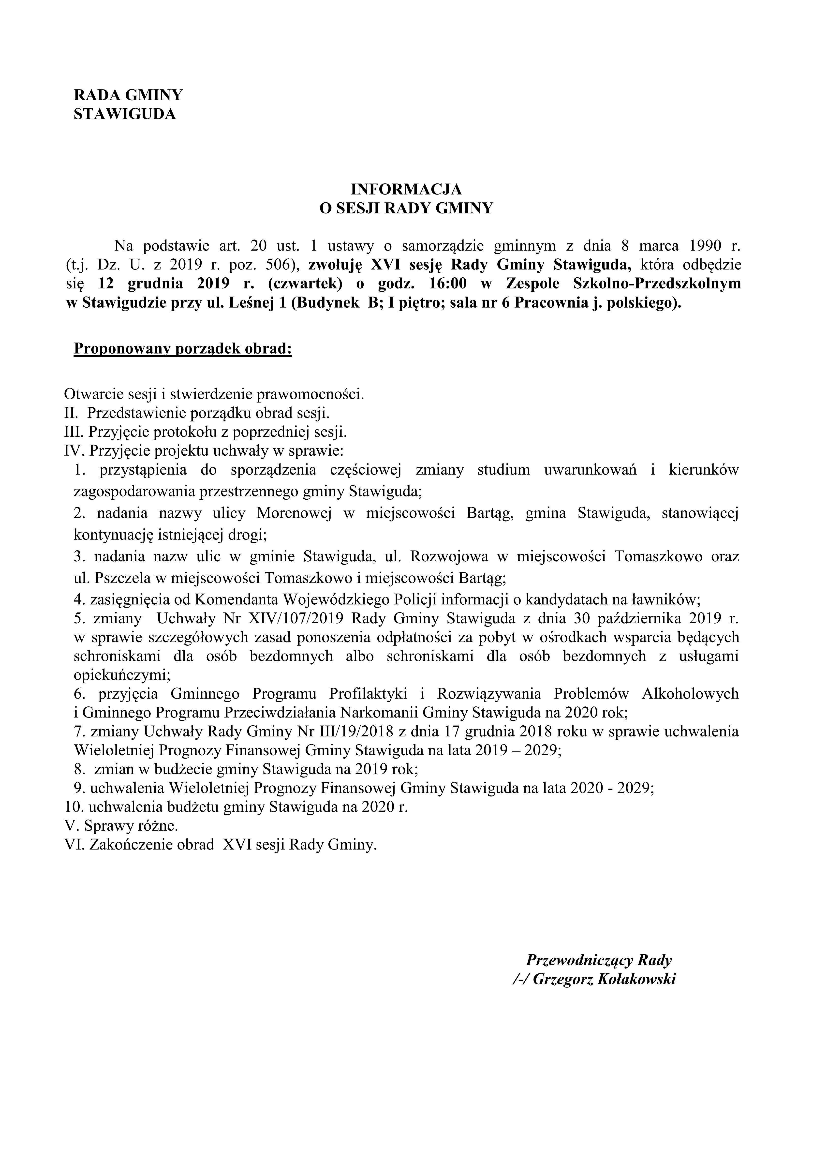 INFORMACJA O SESJI RADY GMINY