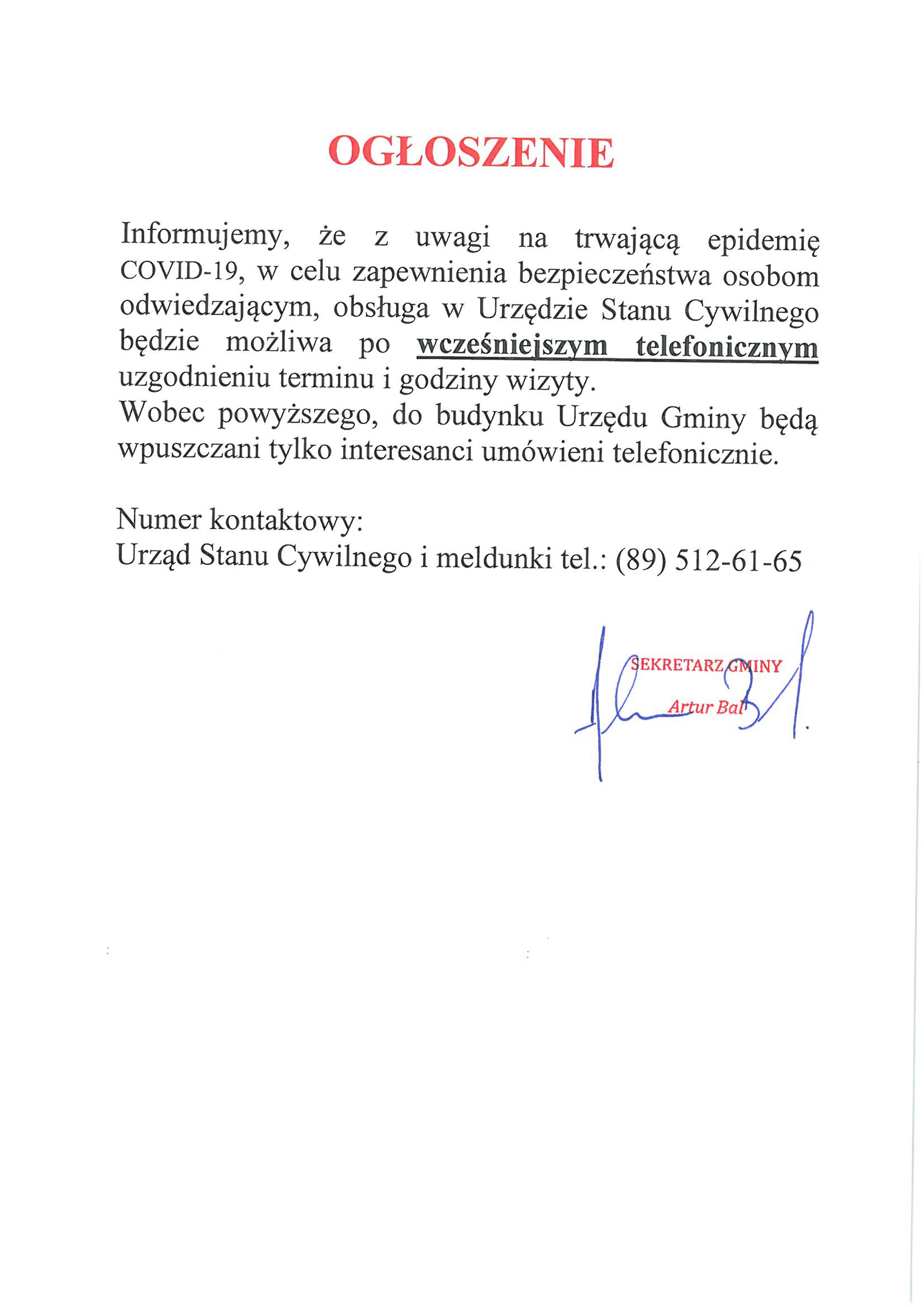 Informacja dot. pracy Urzędu Stanu Cywilnego