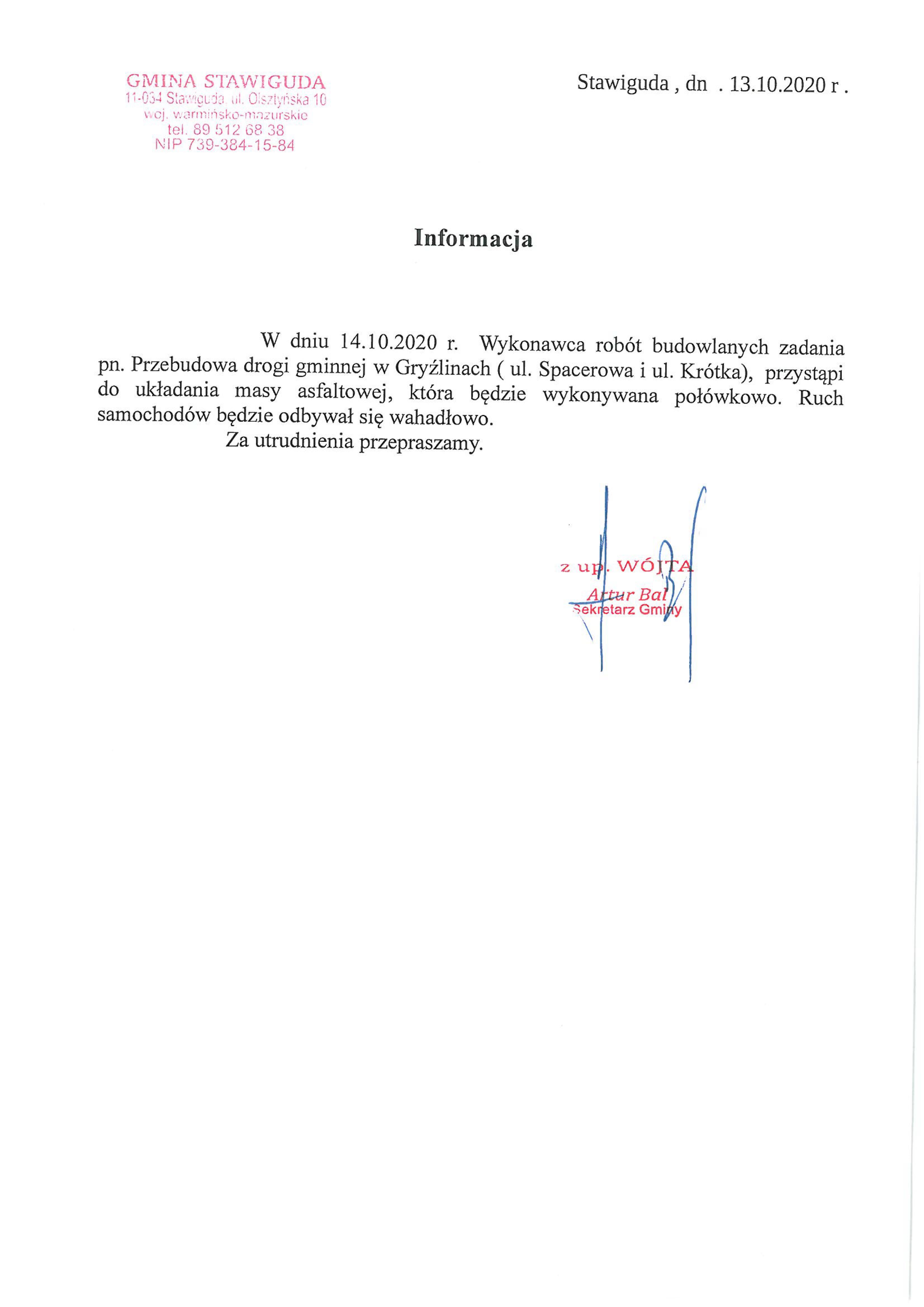 Informacja - prace drogowe w Gryźlinach - 14.10.2020 r.