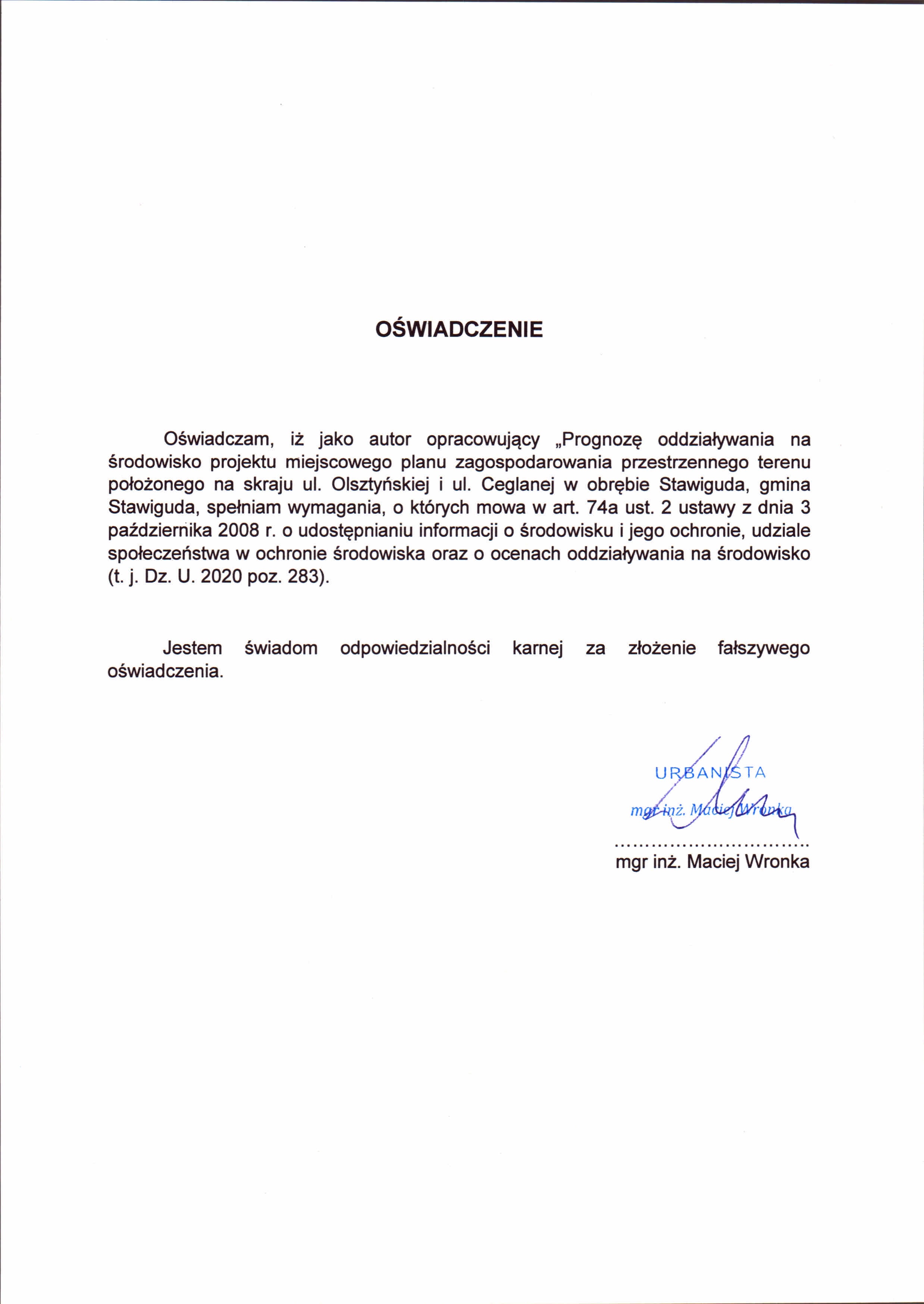 Oświadczenie autora prognozy oddziaływania na środowisko