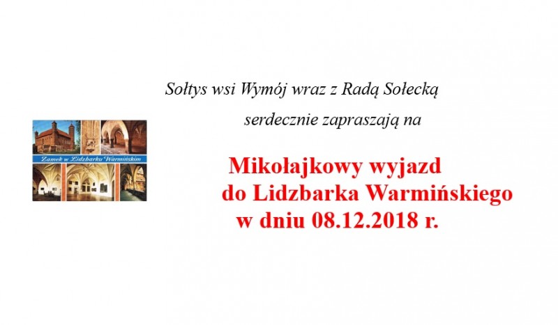 Sołtys wsi Wymój wraz z Radą Sołecką serdecznie zapraszają na Mikołajkowy wyjazd do Lidzbarka Warmińskiego w dniu 08.12.2018 r.