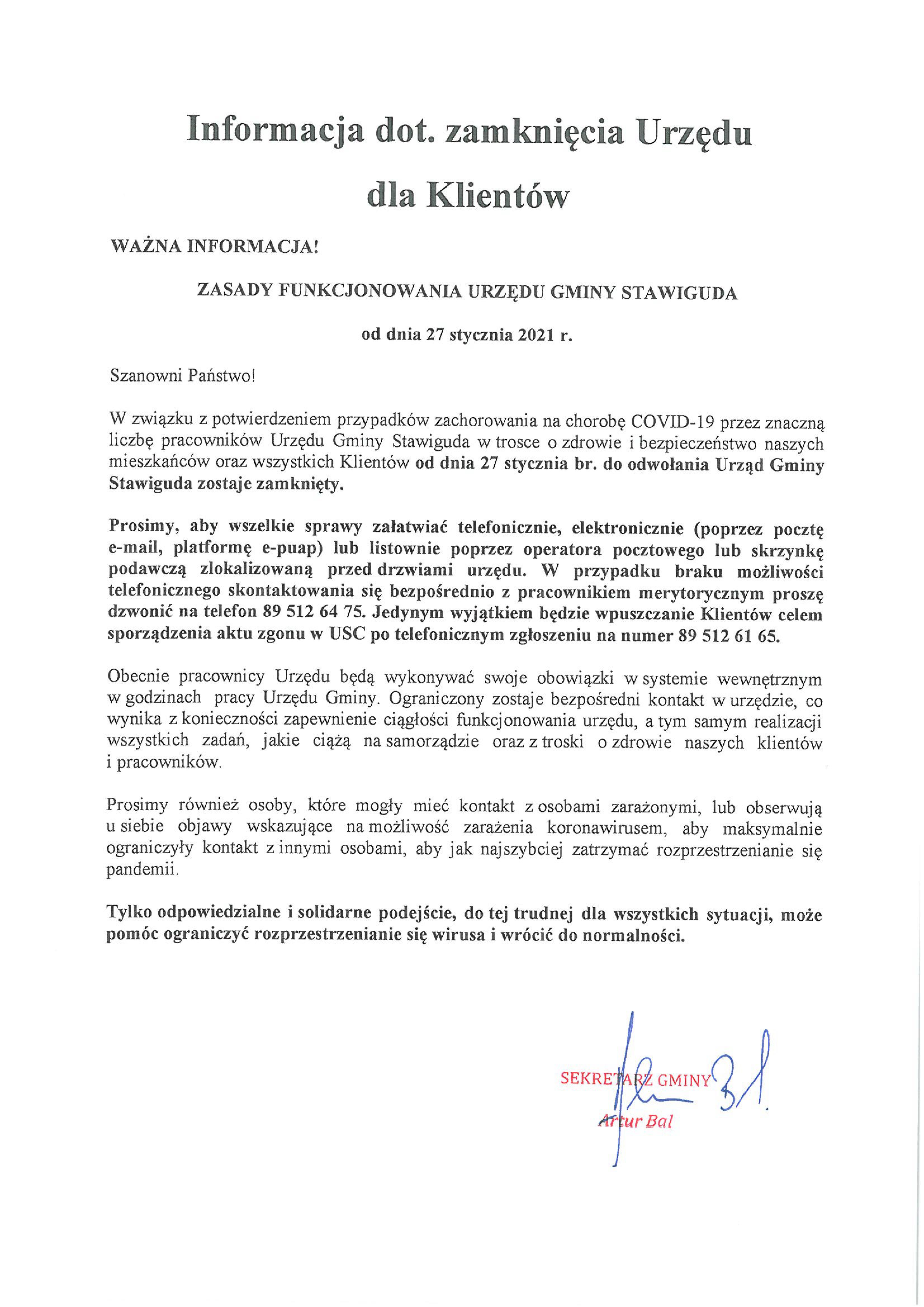 Zasady funkcjonowania Urzędu Gminy w Stawigudzie od 27 stycznia 2021 r.