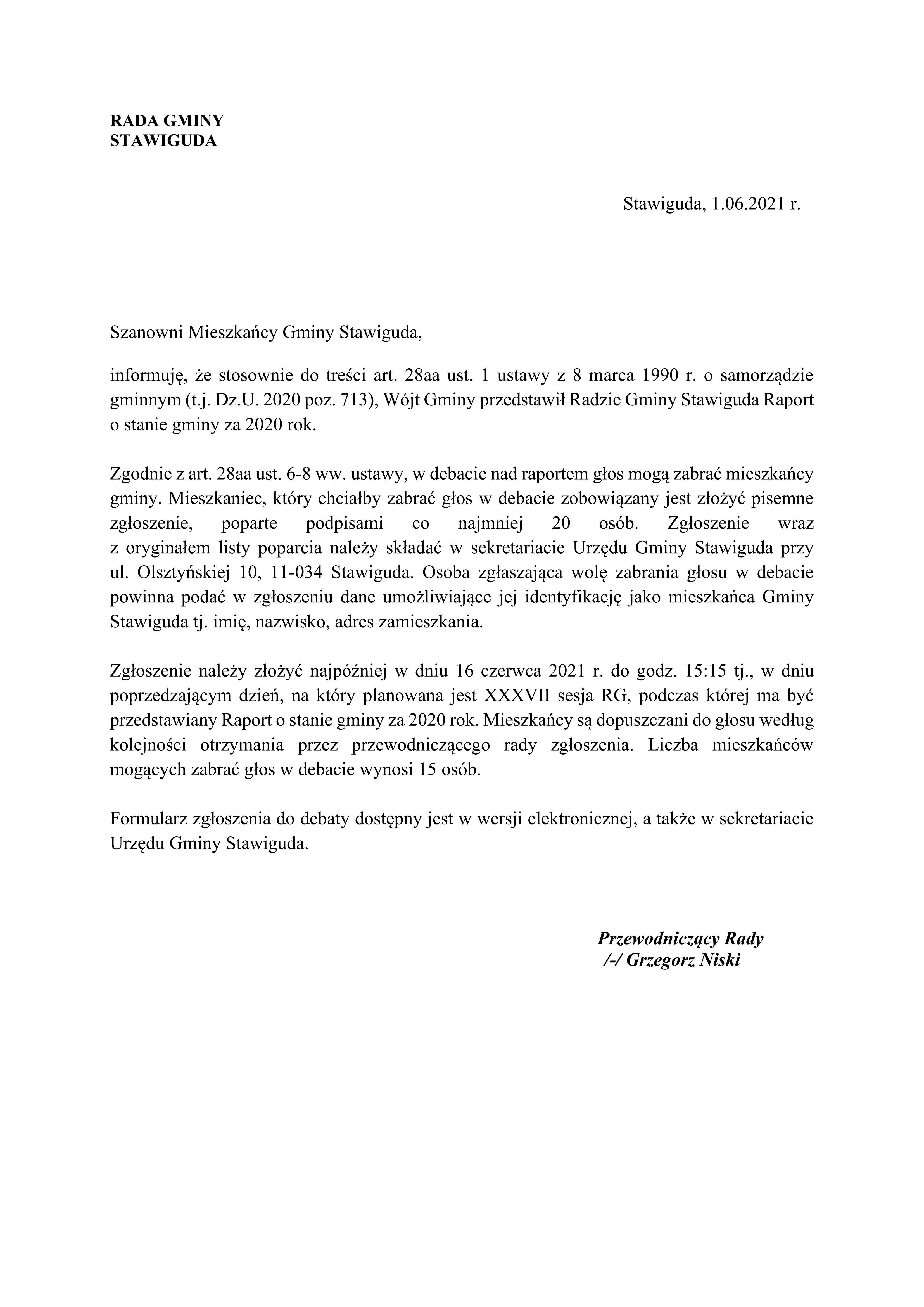 - Zgłoszenie o udziale w debacie nad raportem o stanie gminy