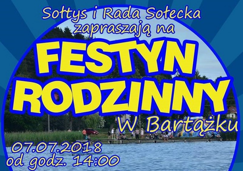 Sołtys i Rada Sołecka Sołectwa Bartążek mają zaszczyt zaprosić na kolejną edycję Festynu Rodzinnego, który odbędzie się już w sobotę 07 lipca br. o godzinie 14:00 w Bartążku.