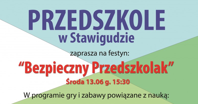Przedszkole w Stawigudzie zaprasza na festyn: "Bezpieczny Przedszkolak" środa 13.06.2018 godzina: 15:30.