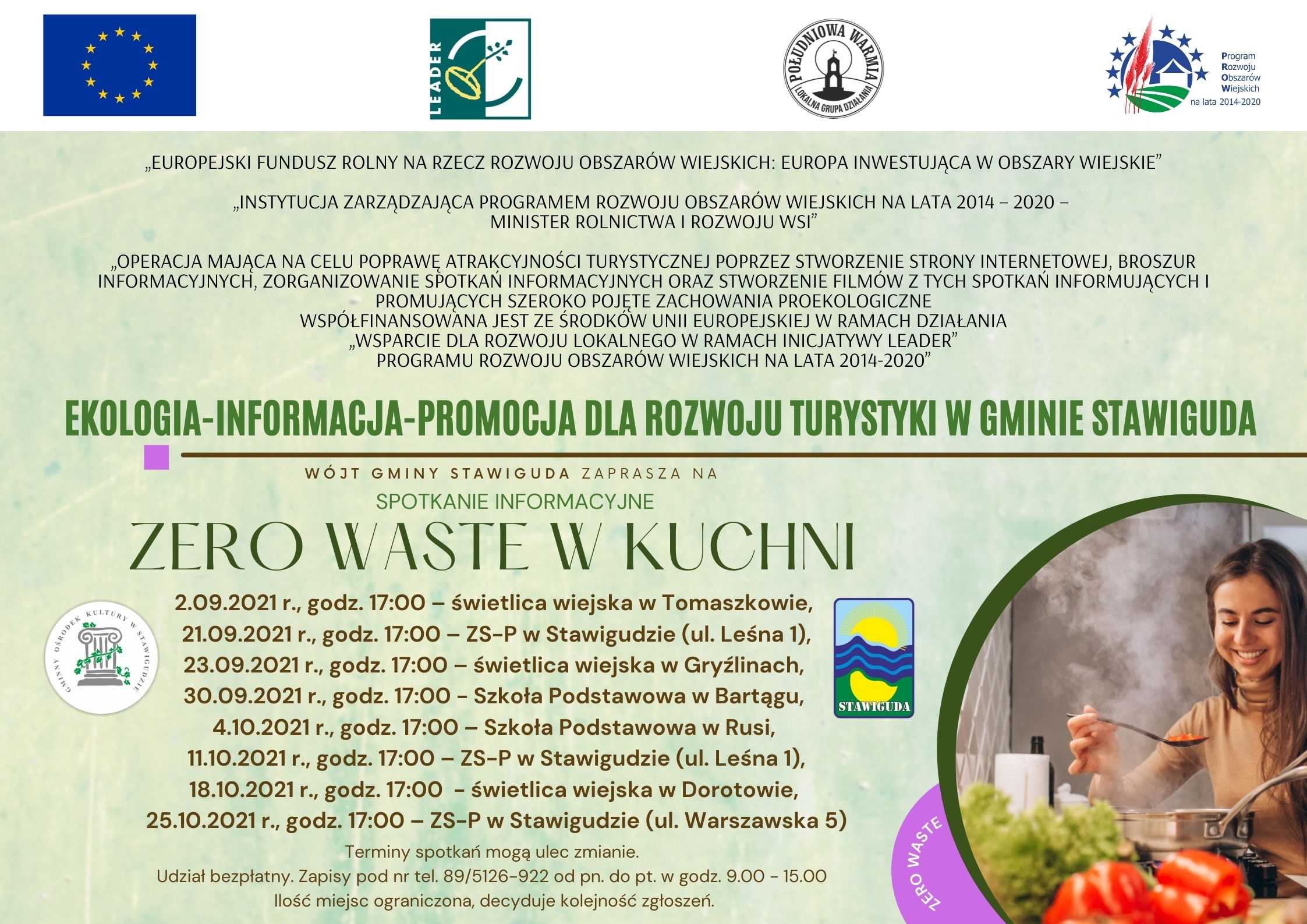 Gmina Stawiguda zaprasza na spotkania informacyjne pt. "Zero Waste w Kuchni", realizowane w ramach projektu "Ekologia - Informacja - Promocja dla rozwoju Turystyki w Gminie Stawiguda", które ODBĘDĄ się w dniach: