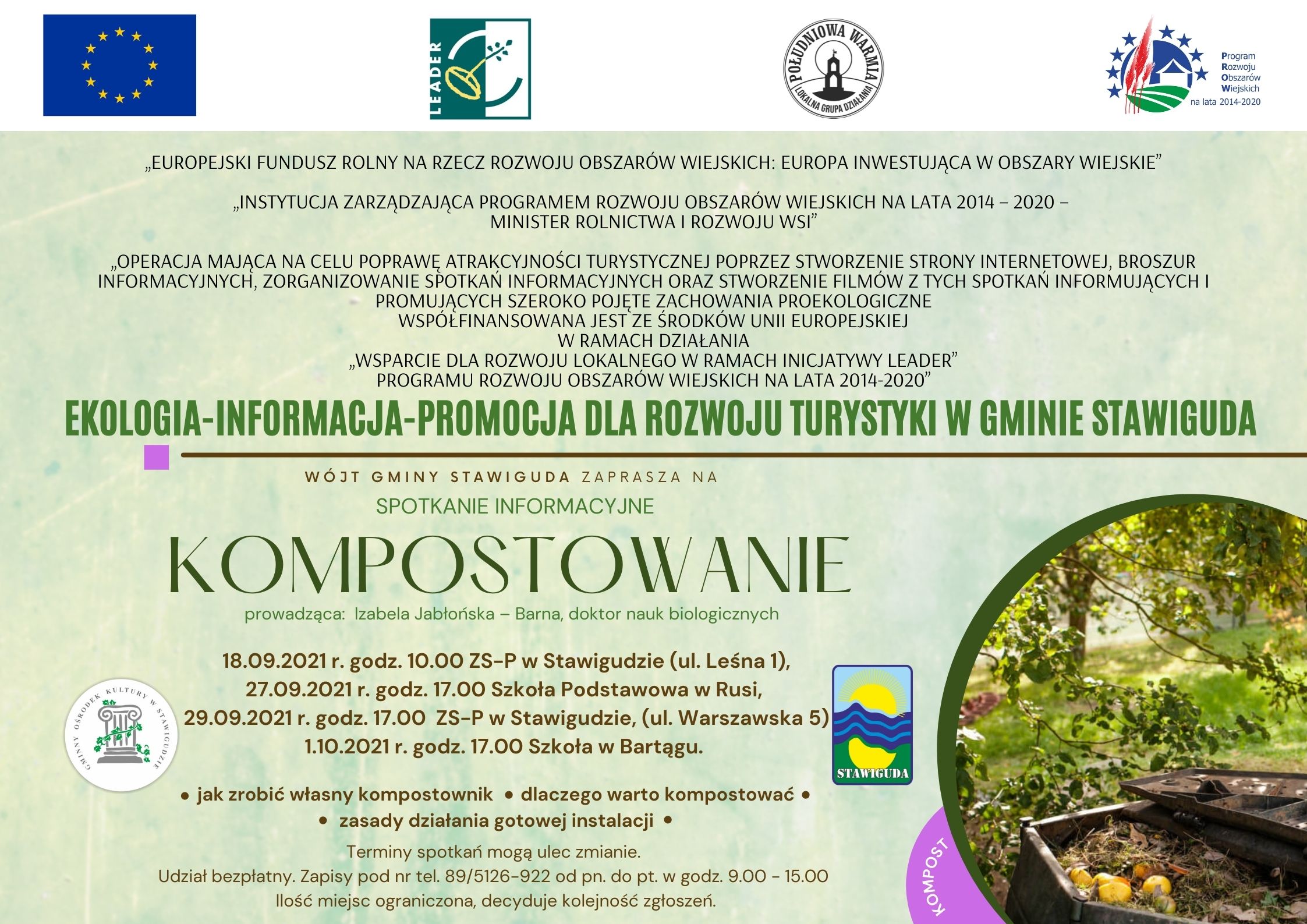 Gmina Stawiguda zaprasza na spotkania informacyjne pt. "Kompostowanie", realizowane w ramach projektu "Ekologia - Informacja - Promocja dla rozwoju Turystyki w Gminie Stawiguda", które odbędą się w dniach: