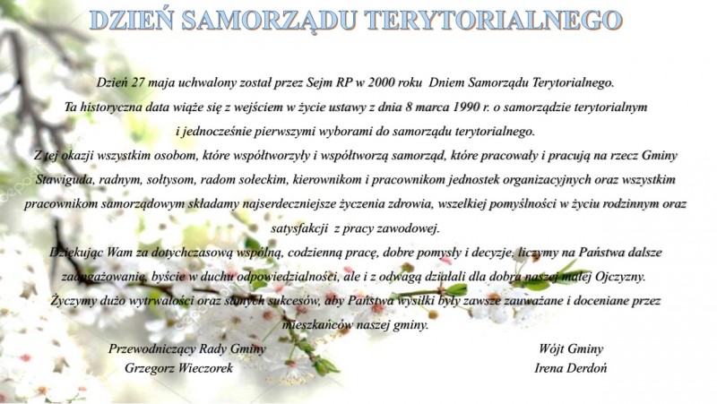Dzień 27 maja uchwalony został przez Sejm RP w 2000 roku Dniem Samorządu Terytorialnego. Ta historyczna data wiąże się z wejściem w życie ustawy z dnia 8 marca 1990 r. o samorządzie terytorialnym i jednocześnie pierwszymi wyborami do samorządu terytorialnego...