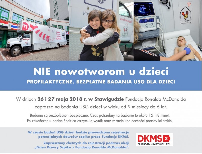 NIE nowotworom u dzieci, profilaktyczne badania USG dla dzieci. W dniach 26 i 27 maja 2018 r. w Stawigudzie Fundacja Ronalda McDonalda zaprasza na badania USG dzieci w wieku od 9 miesięcy do 6 lat.