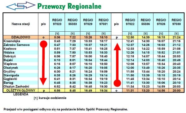 Wyjazdy z Olsztyna Głównego w kierunku Gryźlin: godz. 11.31, 13.20 i 14.56