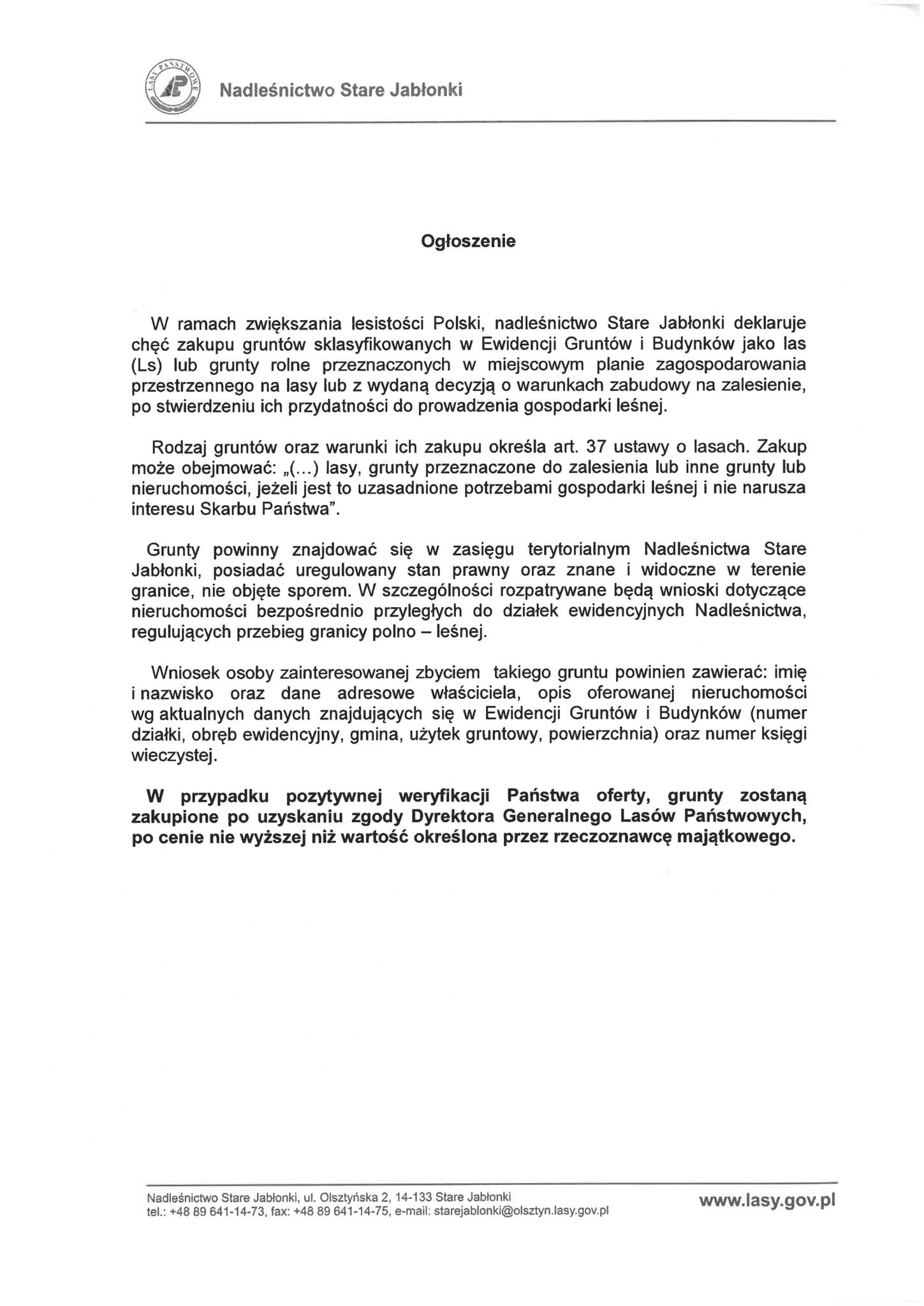W związku z realizacją programu zwiększania lesistości kraju, Nadleśnictwo Stare Jabłonki ogłasza chęć zakupu gruntów sklasyfikowanych jako las (Ls). Szczegółowe informacje można uzyskać w Nadleśnictwie Stare Jabłonki tel. 89 641-14-73