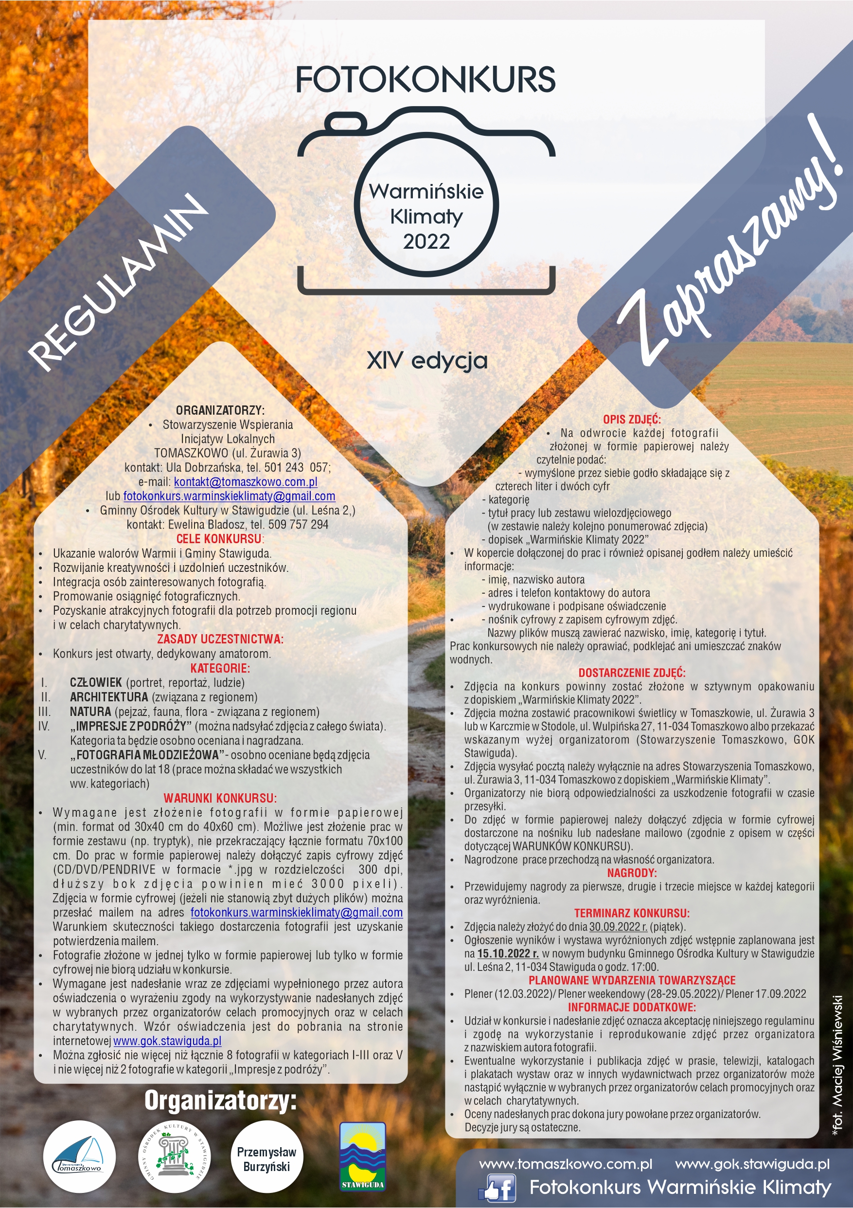Z ogromną przyjemnością ogłaszamy kolejną edycję Fotokonkursu „Warmińskie Klimaty 2022”. Po raz XIV organizatorzy Stowarzyszenie Inicjatyw Lokalnych TOMASZKOWO, Gminny Ośrodek Kultury w Stawigudzie wraz z Gminą Stawiguda oraz partnerami zapraszamy do udziału w konkursie jak również do uczestnictwa w wydarzeniach towarzyszących.