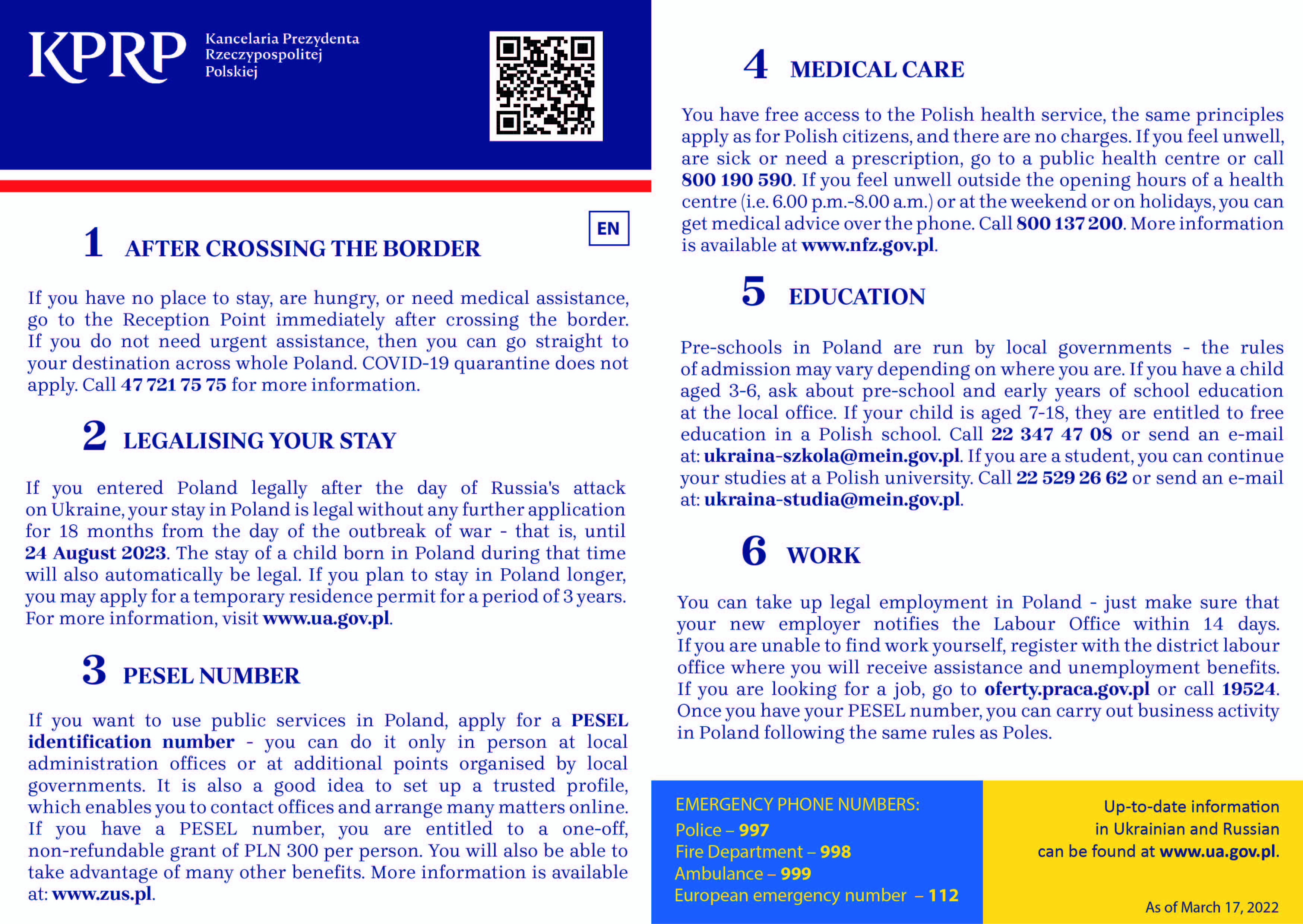 W związku z dużym odzewem, z jakim spotkała się przygotowana przez Kancelarię Prezydenta Rzeczypospolitej Polskiej ulotka informacyjna dla uchodźców z Ukrainy, w przystępny sposób ułatwiająca funkcjonowanie w pierwszych godzinach i dniach pobytu w naszym kraju została przygotowana jej, zaktualizowana wersja.